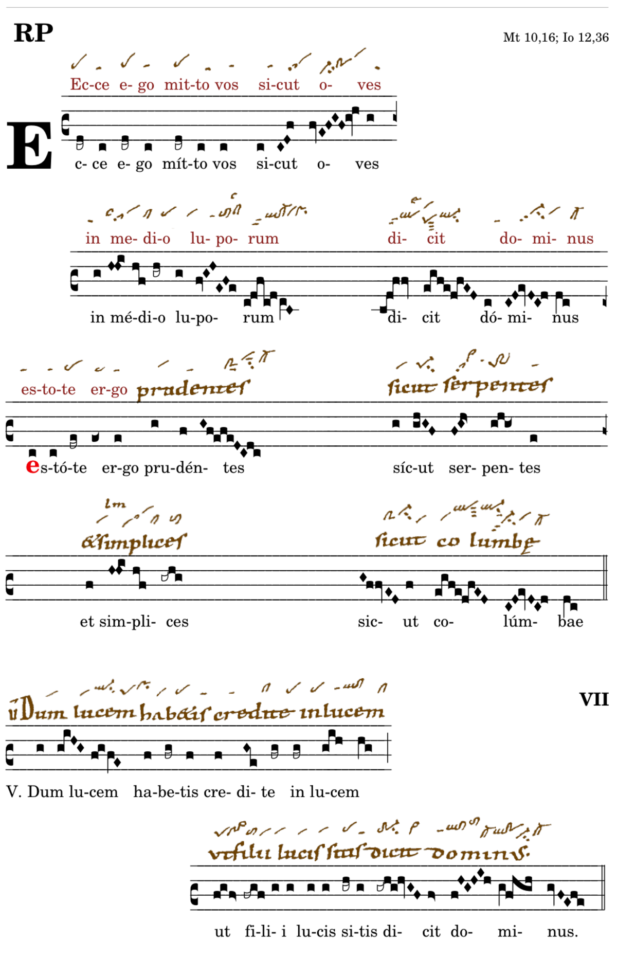 Ecce ego mitto vos sicut oves / in medio luporum / dicit dominus / 📍Estote ergo prudentes / sicut serpentes / et simplices / sicut columbae. V. Dum lucem habetis credite in lucem* ut filii lucis sitis (dicit dominus).