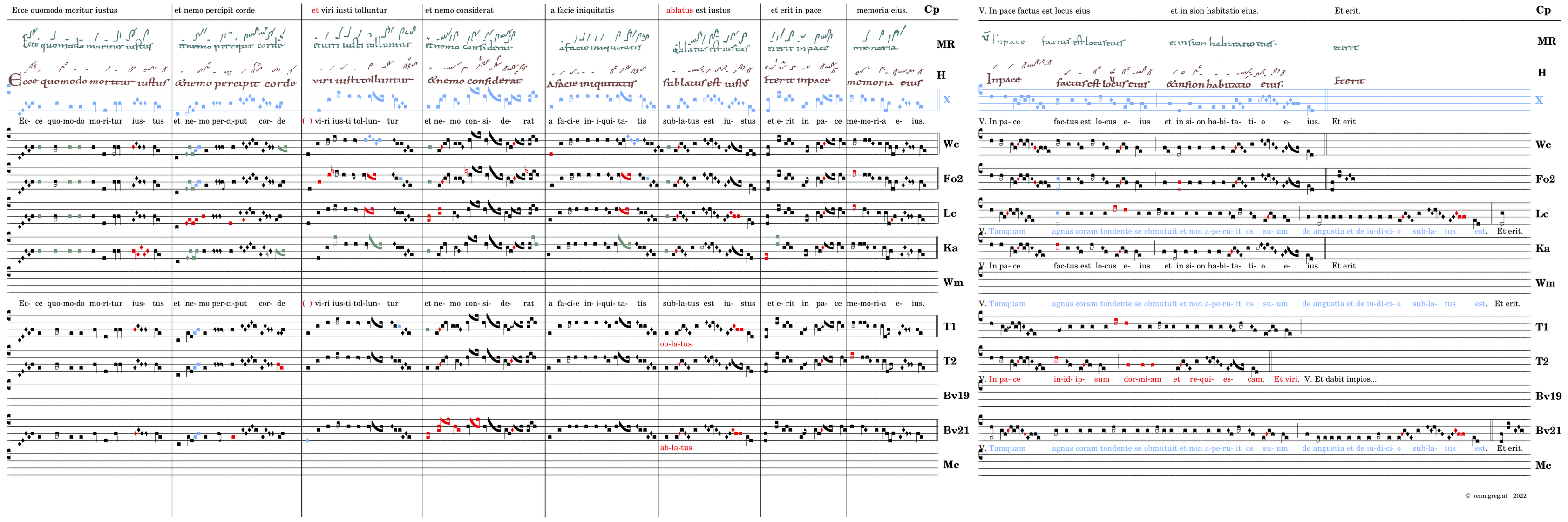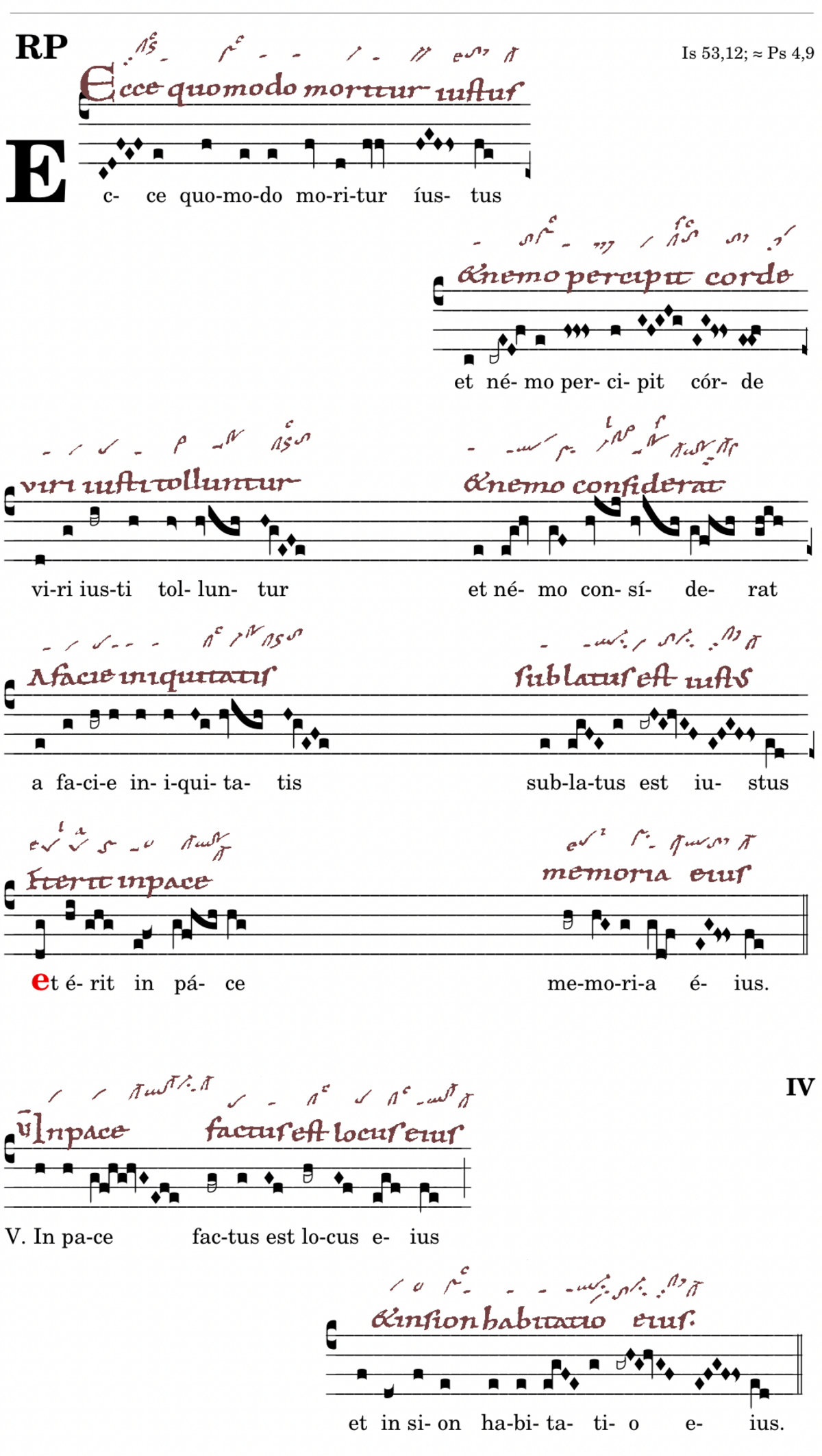 Ecce quomodo moritur iustus / et nemo perciput corde / (📍et) viri iusti tolluntur / et nemo considerat / a facie iniquitatis / sublatus est iustus / 📍 et erit in pace / memoria eius. V. In pace factus est locus eius* et in sion habitatio eius. (T1,Lc,Bv2) V. Tamquam agnus tondentes se obmutuit et non aperuit os suum / de angustia et de iudicio sublatus est. (T2) V. In pace inidipsum dormiam et requiescam.