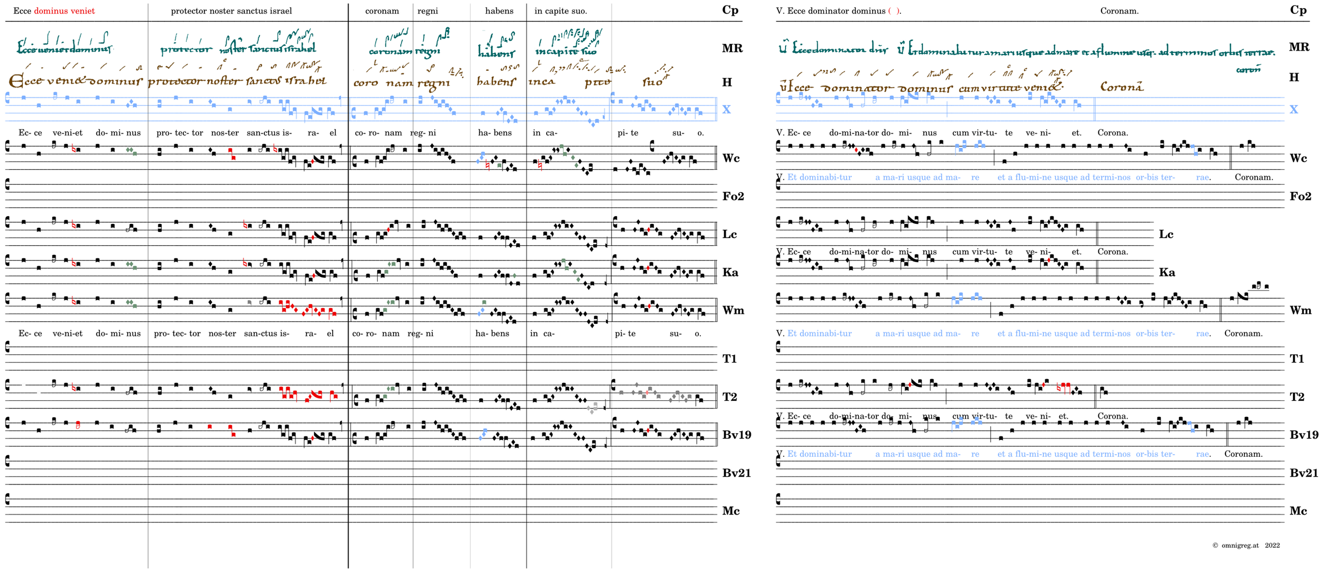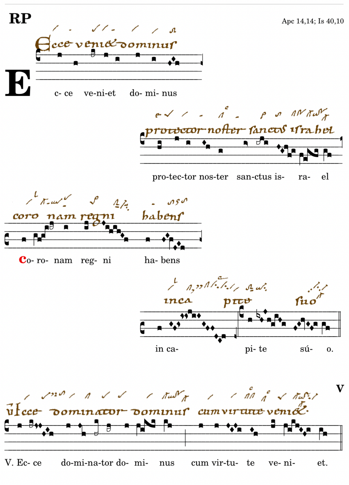 Ecce veniet dominus / protector noster sanctus israel / 📍Coronam regni habens / in capite suo. V. Ecce dominator dominus* cum virtute veniet. (MR,Wc,Wm,Zw,Bv) V. Et dominabitur a mari usque ad mare et a flumine usque ad terminos orbis terrarum. (Ka) Ecce veniet dominus princeps regum terre / 📍beati qui parati sunt occurrere / illi habebunt patrem in civitate hierusalem. V. Ecce dominator dominus* cum virtute veniet.