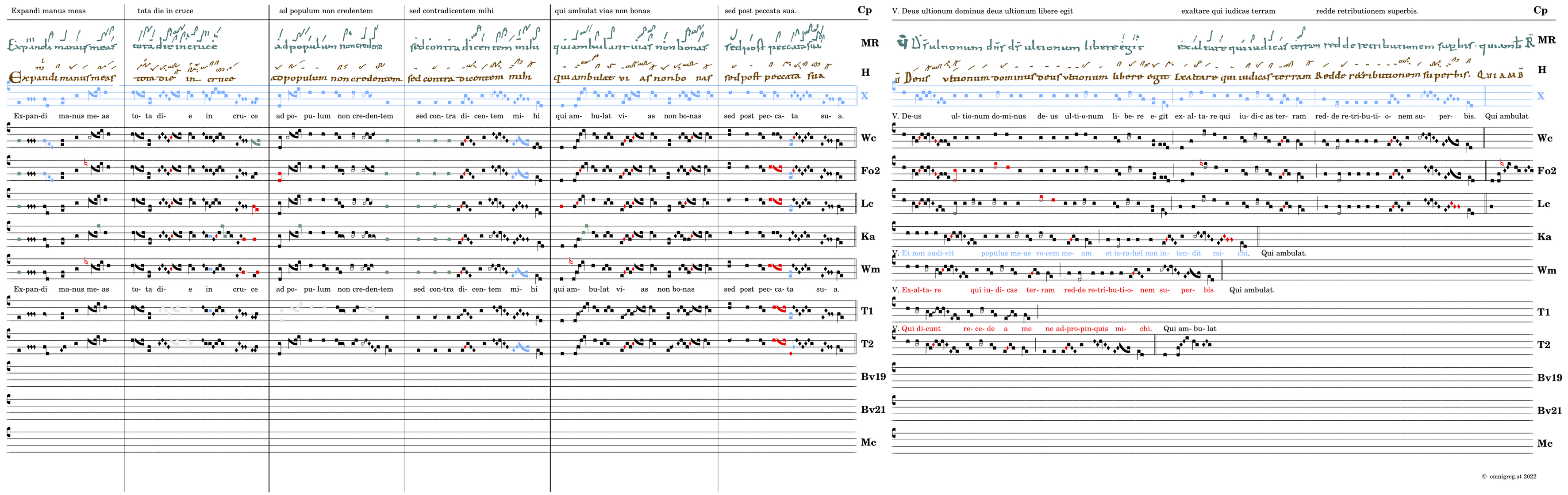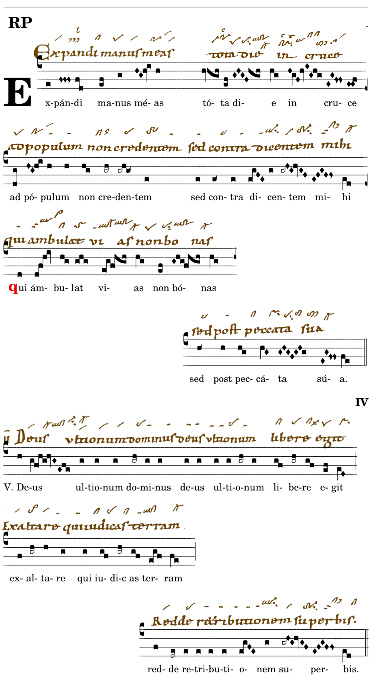 Expandi manus meas / tota die in cruce / ad populum non credentem / sed contra dicentem mihi / 📍Qui ambula(n)t vias non bonas / sed post peccata sua. V. Deus ultionum dominus deus ultionum libere egit exaltare qui iudicas terram* redde retributionem superbis. (Ka) V. Et non audivit populus meus vocem meam et israhel non intendit michi. (Tol) V. Qui dicunt recede a me non apropinques michi. (Wm) V. Exaltare qui iudicas terram redde retributionem superbis.