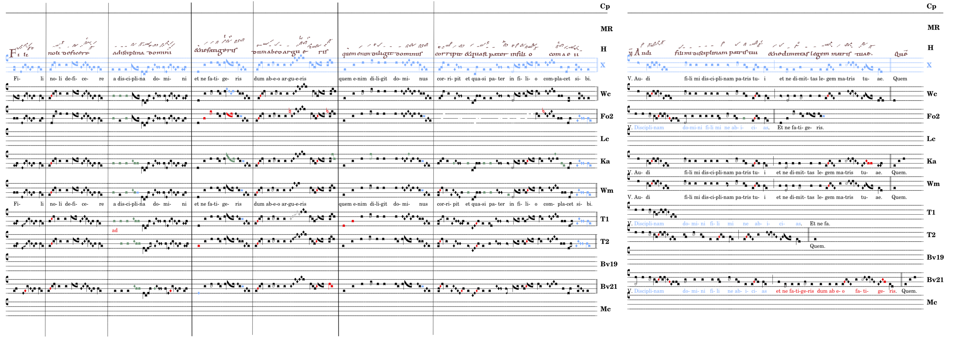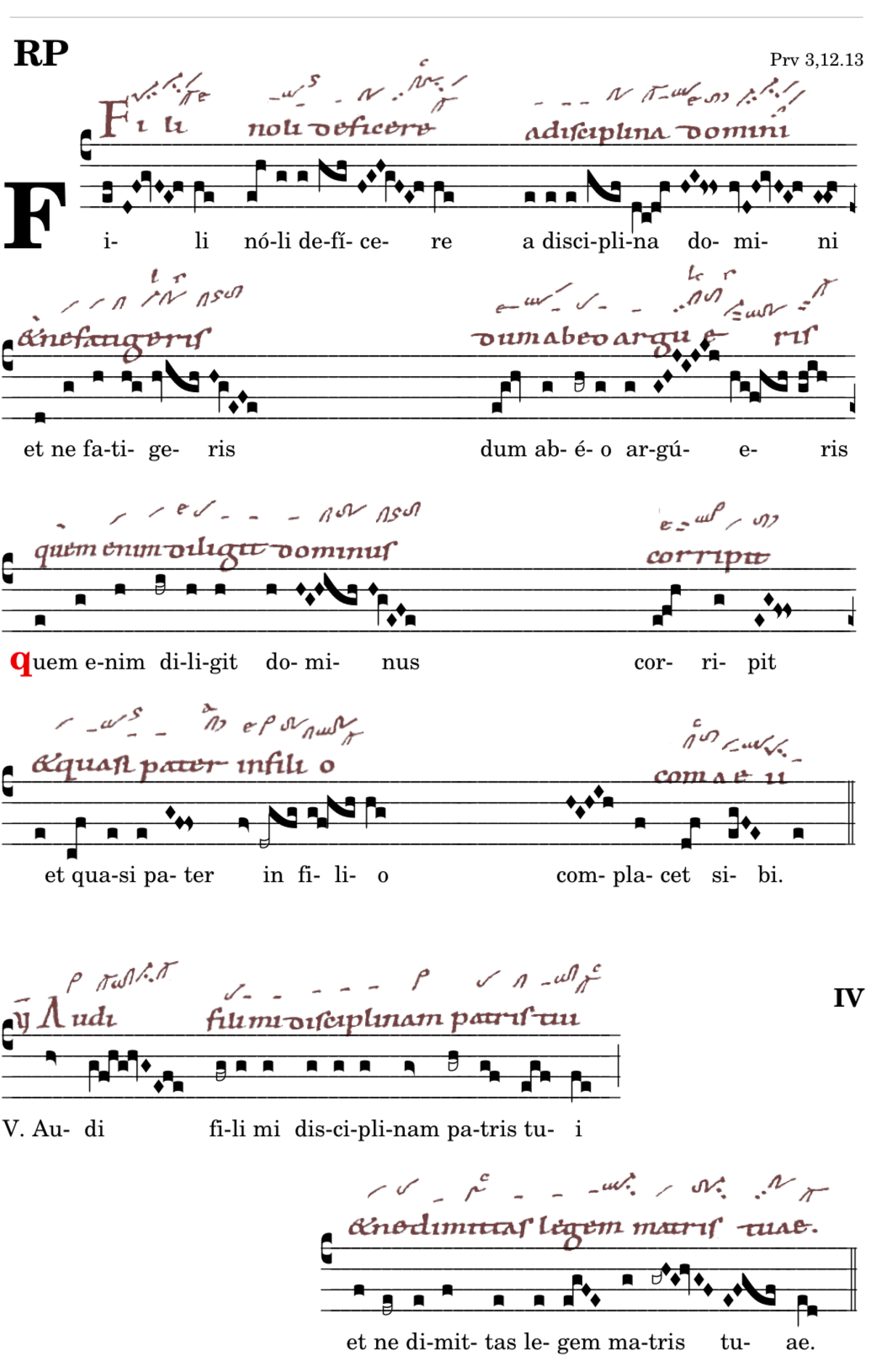 Fili / noli deficere / a disciplina domini / 📍et ne fatigeris / dum abeo argueris / 📍Quem enim diligit dominus / corripit / et quasi pater in filio / complacet sibi. V. Audi fili mi disciplinam patris tui* et ne dimittas legem matris tuae. (Tol,Fo2,Bv2) V. Disciplinam domini fili ne abicias et ne fatigeris (dum ab eo argueris).
