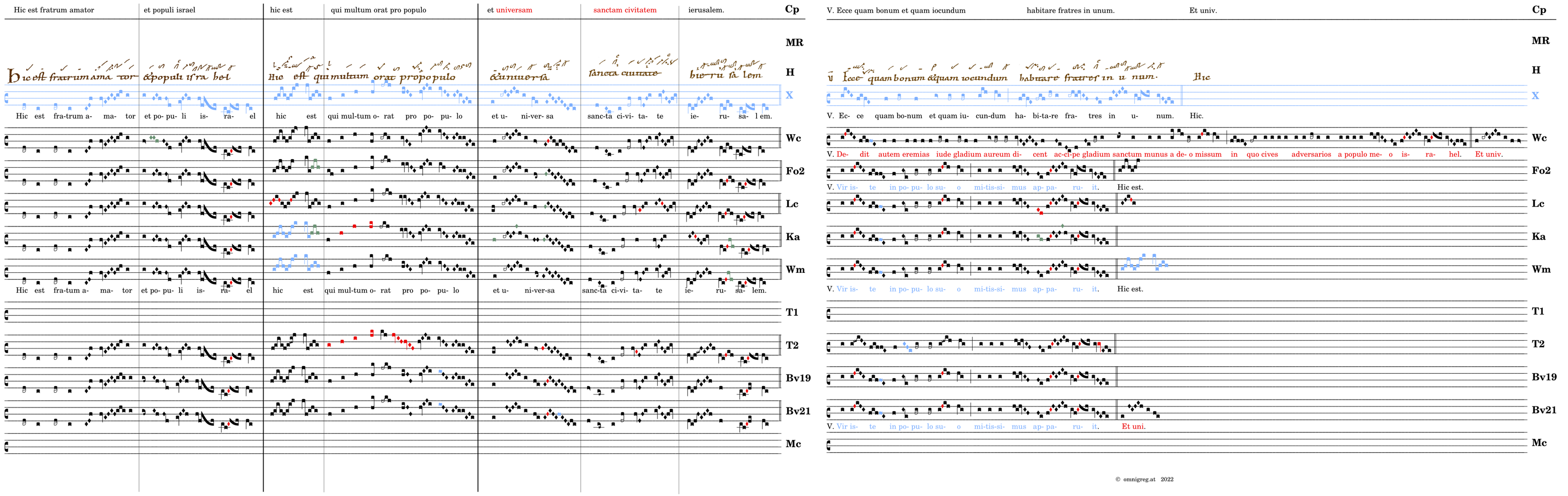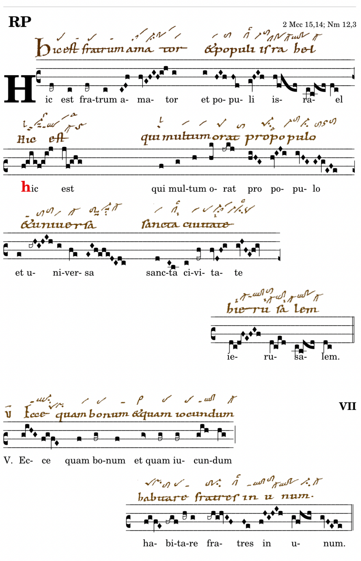 Hic est fratum amator / et populi israel / 📍Hic est / qui multum orat pro populo / 📍et universa / sancta civitate / ierusalem. V. Ecce quam bonum et quam iucundum* habitare fratres in unum. (omnes) V.Vir iste in populo suo mitissimus apparuit. (Wc) V.Dedit autem eremias iude gladium aureum dicent* accipe gladium sanctum munus a deo missum in quo cives adversarios a populo meo israhel.