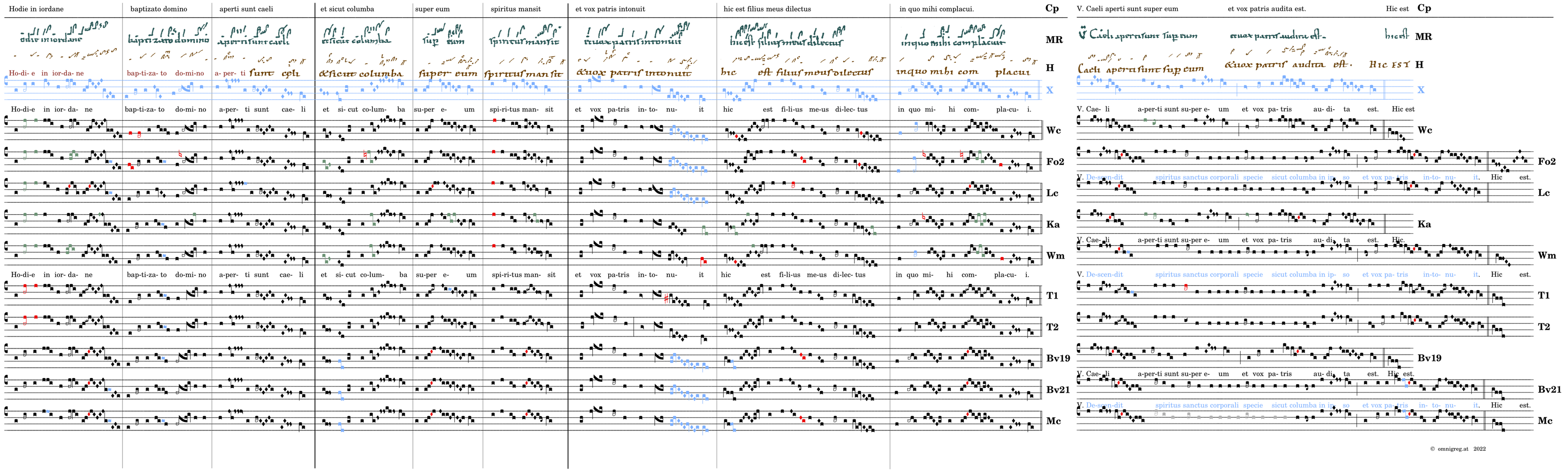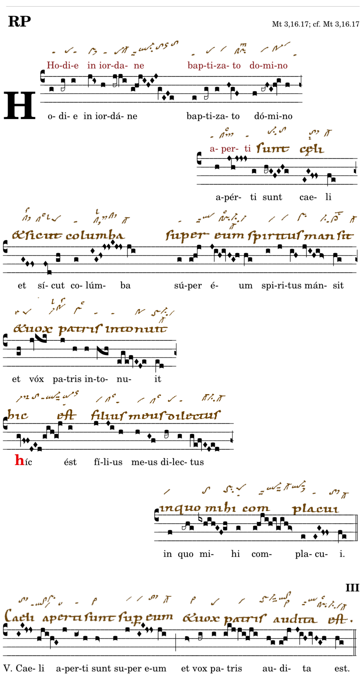 Hodie in iordane / baptizato domino / aperti sunt caeli / et sicut columba / super eum / spiritus mansit / et vox patris intonuit 📍Hic est / filius meus dilectus / in quo mihi complacui(t). V. Caeli aperti sunt super eum* et vox patris audita est. (Fo2,Lc,Tol,Bv2,Mc) V. Descendit spiritus sanctus / corporali specie sicut columba in ipsum (-eum) et vox de caelo facta est (-vox patris intonuit).