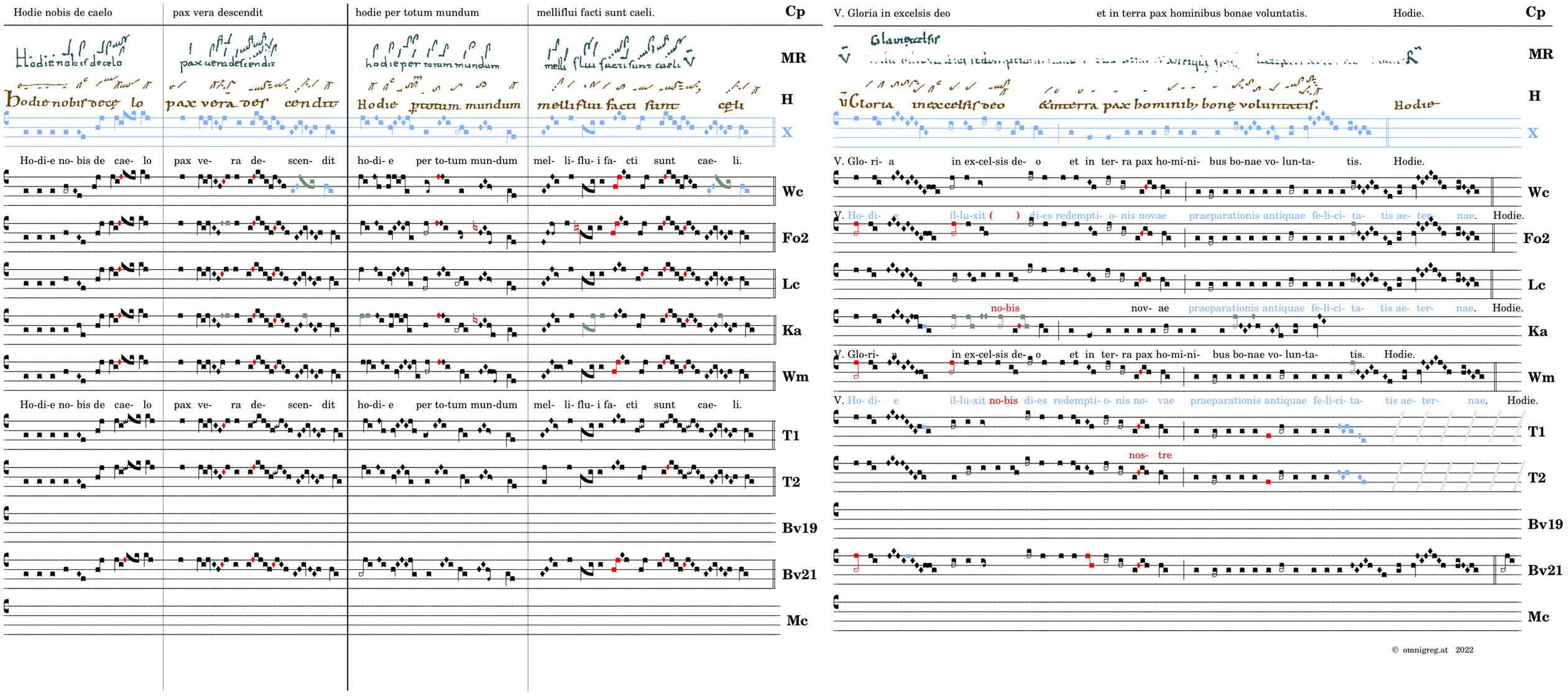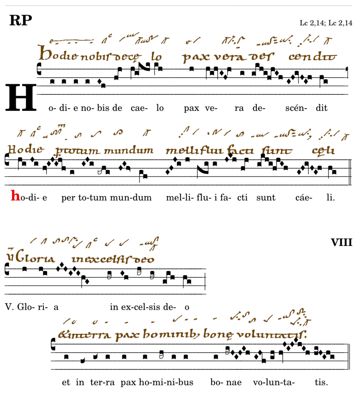 Hodie nobis de caelo / pax vera descendit / 📍Hodie per totum mundum / melliflui facti sunt caeli. V. Gloria in excelsis deo* et in terra pax hominibus bonae voluntatis. (omnes) V. Hodie illuxit nobis dies redemptionis novae praeparattionis antiquae felicitatis aeternae.
