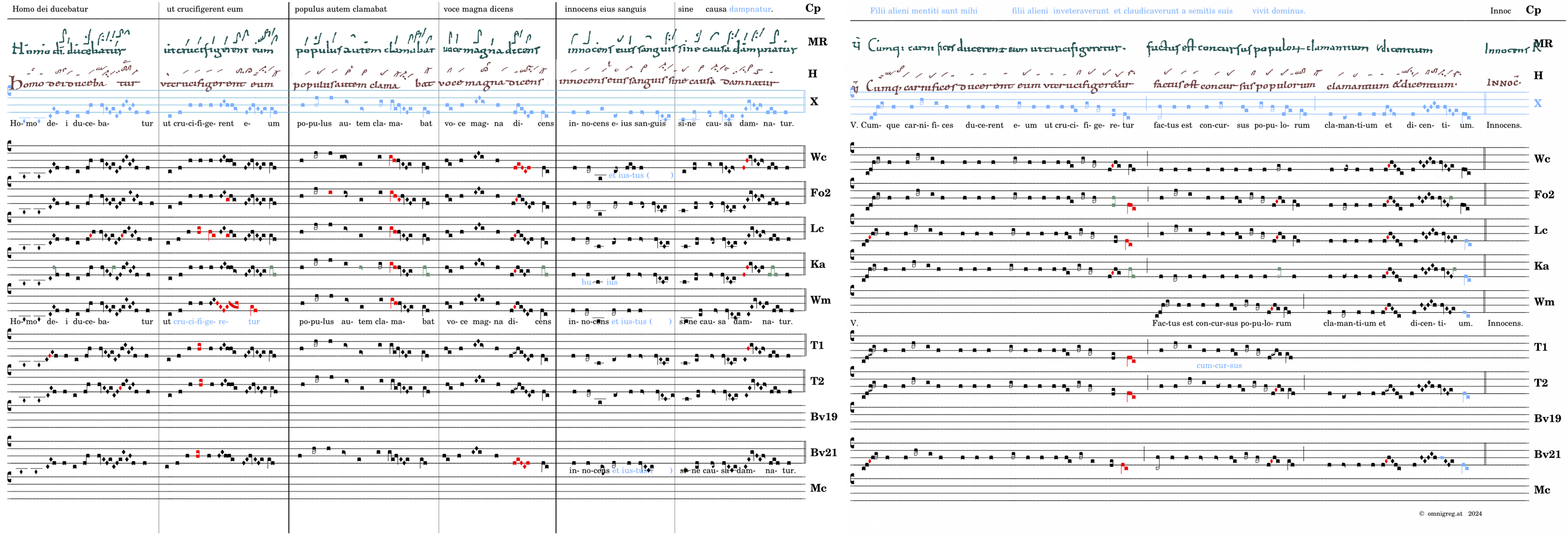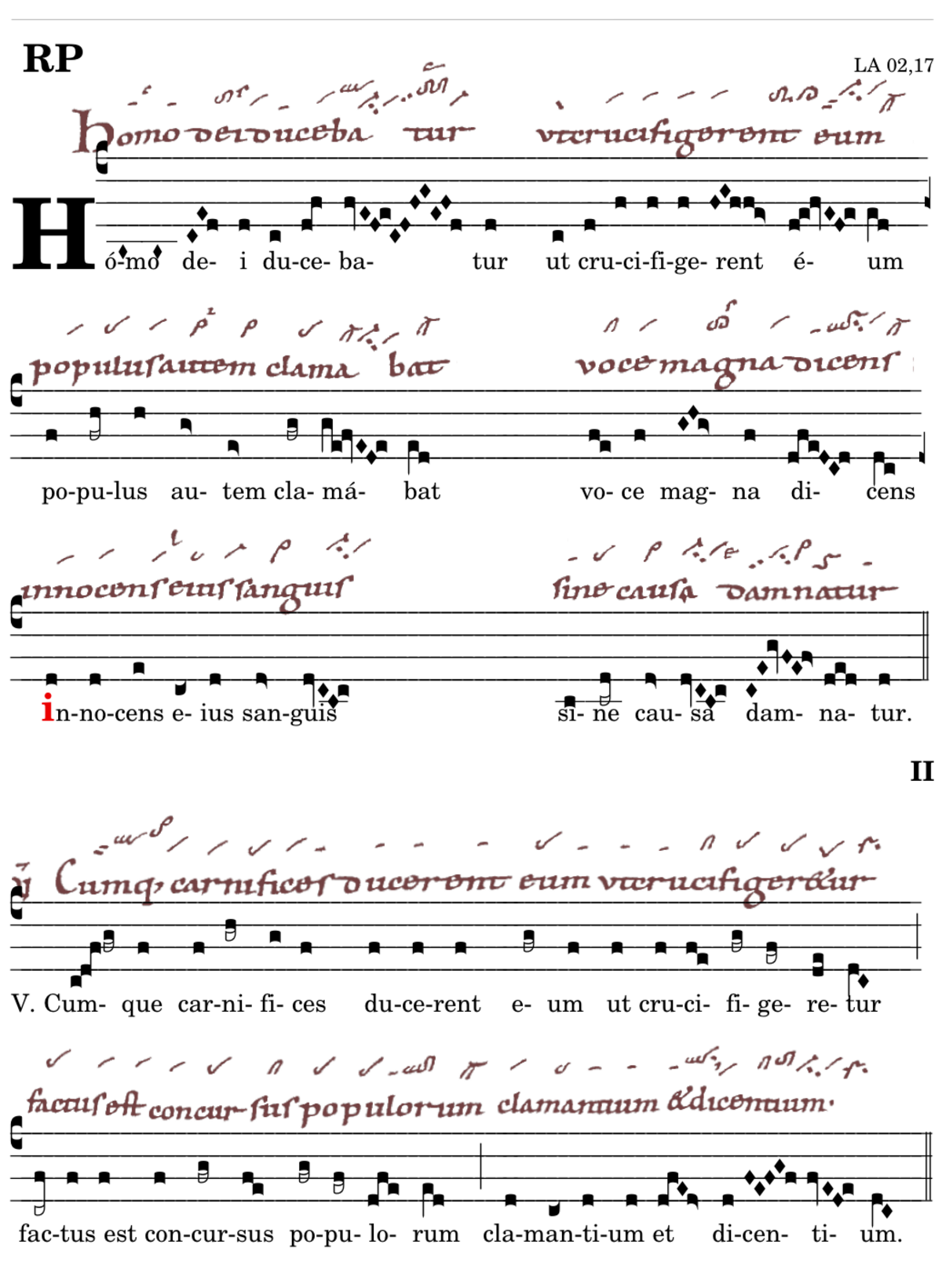 Homo dei ducebatur / ut crucifigerent eum / populus autem clamabat / voce magna dicens / 📍Innocens eius sanguis / sine causa damnatur. V. Cumque carnifices ducerent eum ut crucifigeretur . factus est concursus populorum* clamantium et decentium.