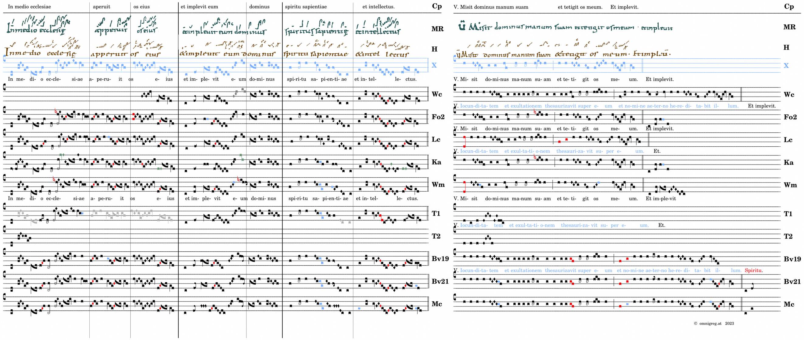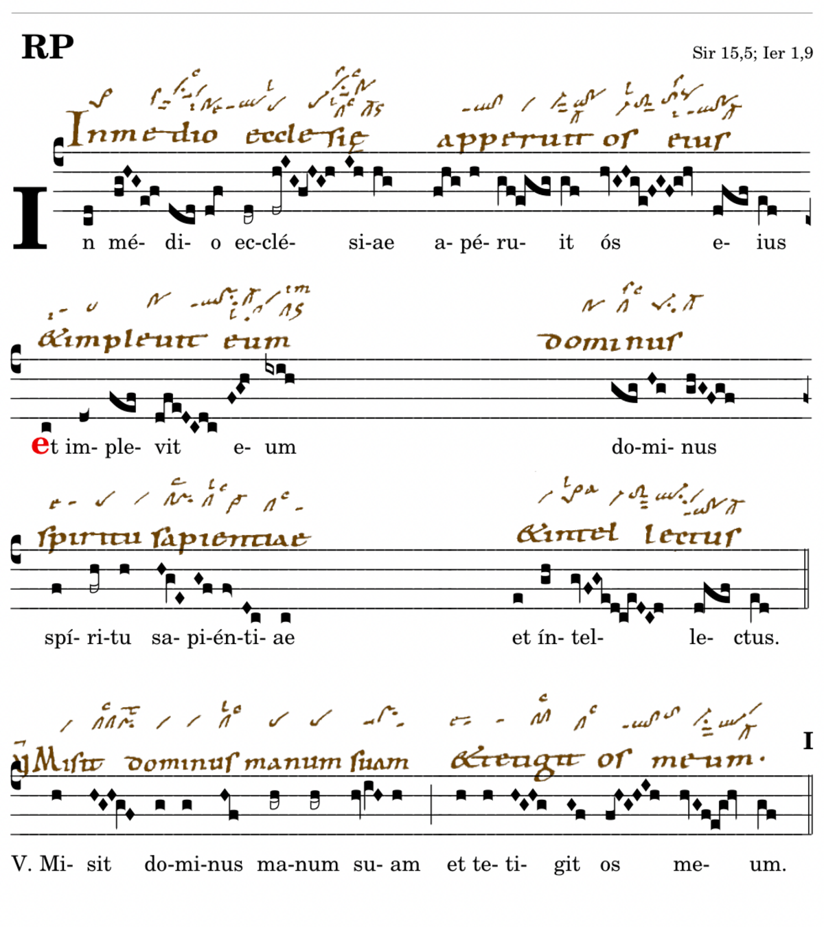 In medio ecclesiae / aperuit / os eius / 📍Et implevit / eum dominus / 📍spiritu sapientiae / et intellectus. V. Misit dominus manum suam* et tetigit os meum (- eius). (Wc,Lc,Tol,Bv,Mc) V. Iocunditatem et exultationem thesaurizavit super eum (et nomine aeterno hereditavit illum).