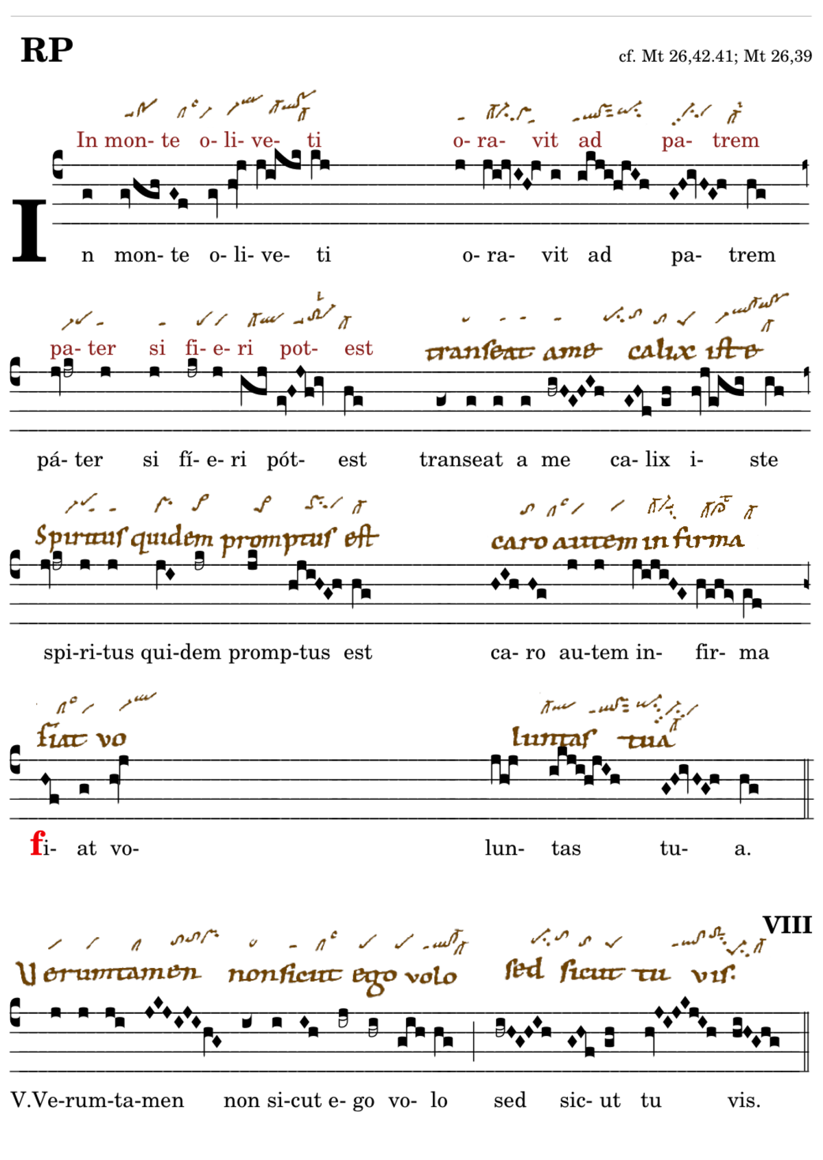 In monte oliveti / oravit ad patrem . pater si fieri potest / transeat a me calix iste / 📍spiritus quidem promptus est / caro autem infirma / 📍Fiat vo / luntas tua. V. Verumtamen non sicut ego volo* sed sicut tu vis. (Wc,Lc,Tol) V. Vigilate et orate ut non intretis in tentationem.