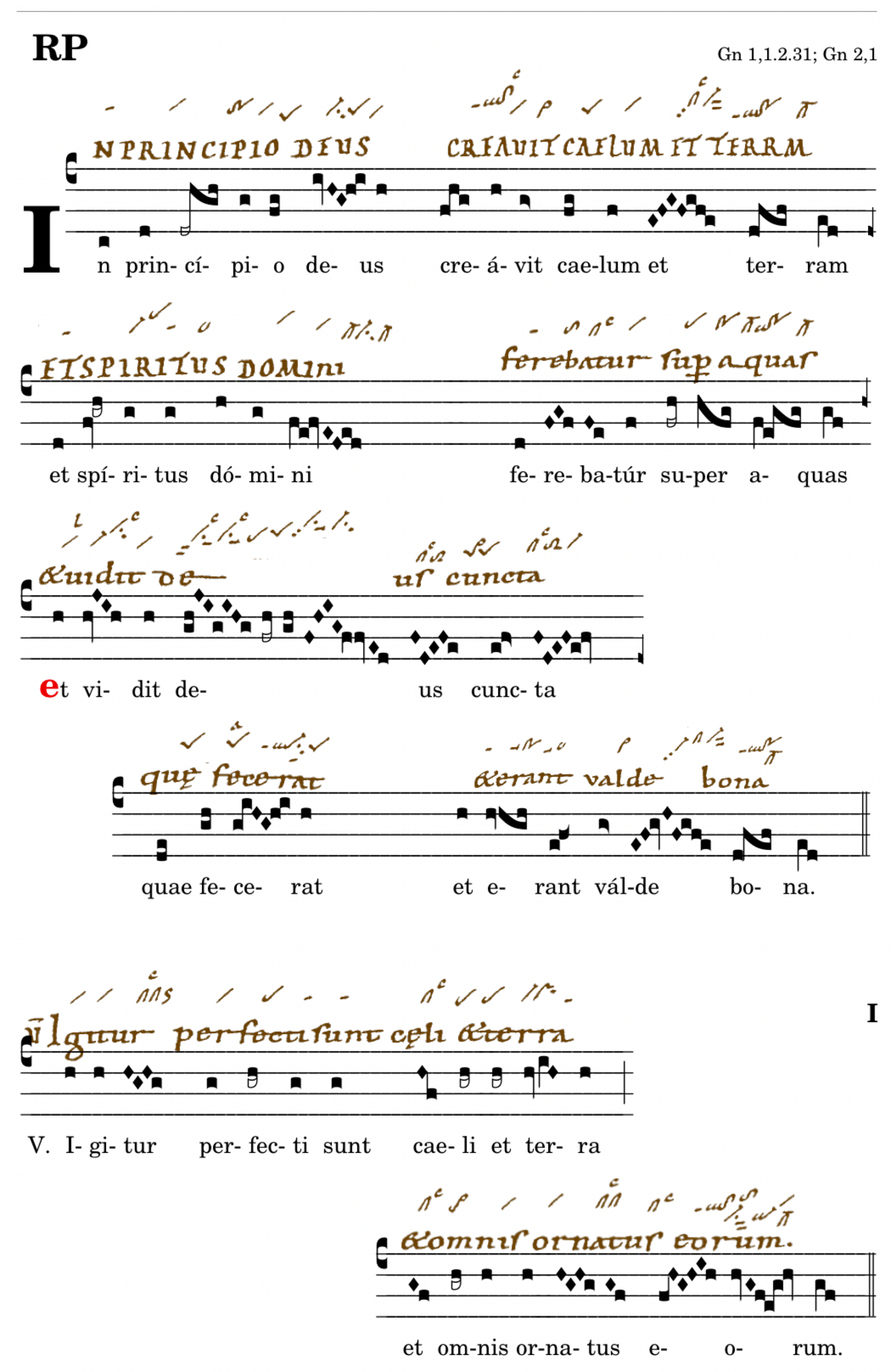 In principio deus / creavit caelum et terram / et spiritus domini / ferebatur super aquas / 📍Et vidit deus cuncta / quae fecerat / et erant valde bona. V. Igitur perfecti sunt caeli et terra* et omnis ornatus eorum.