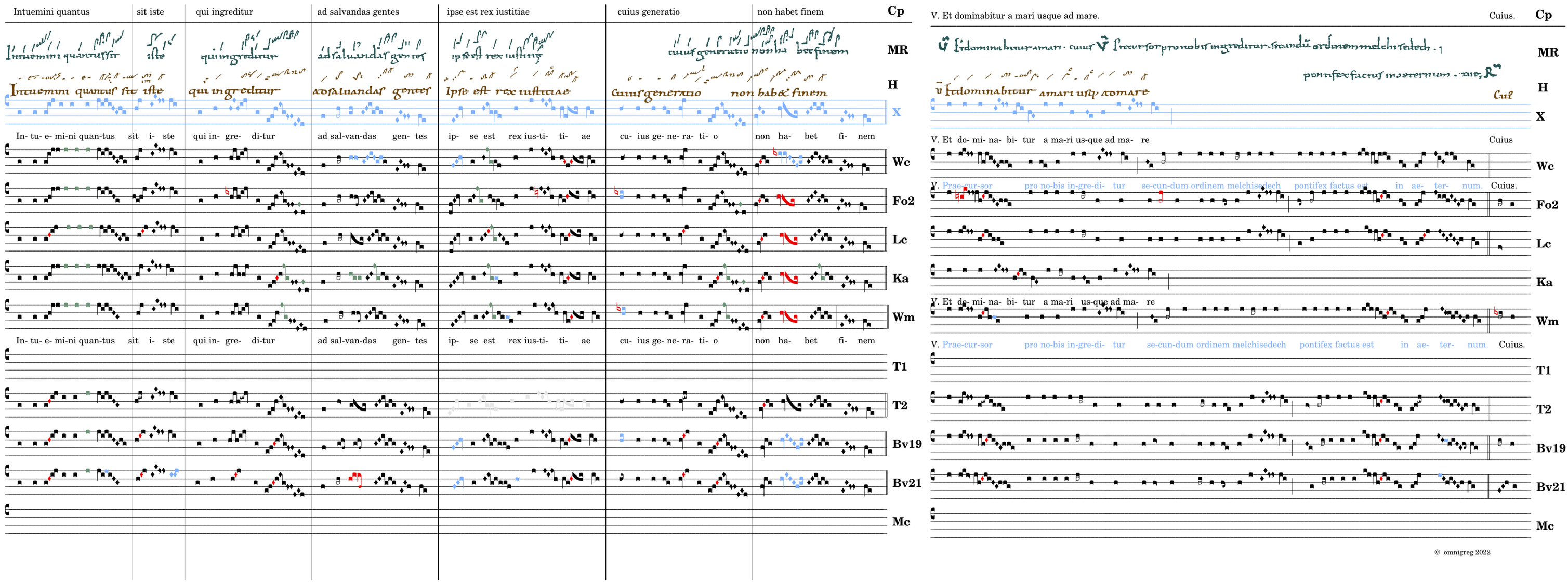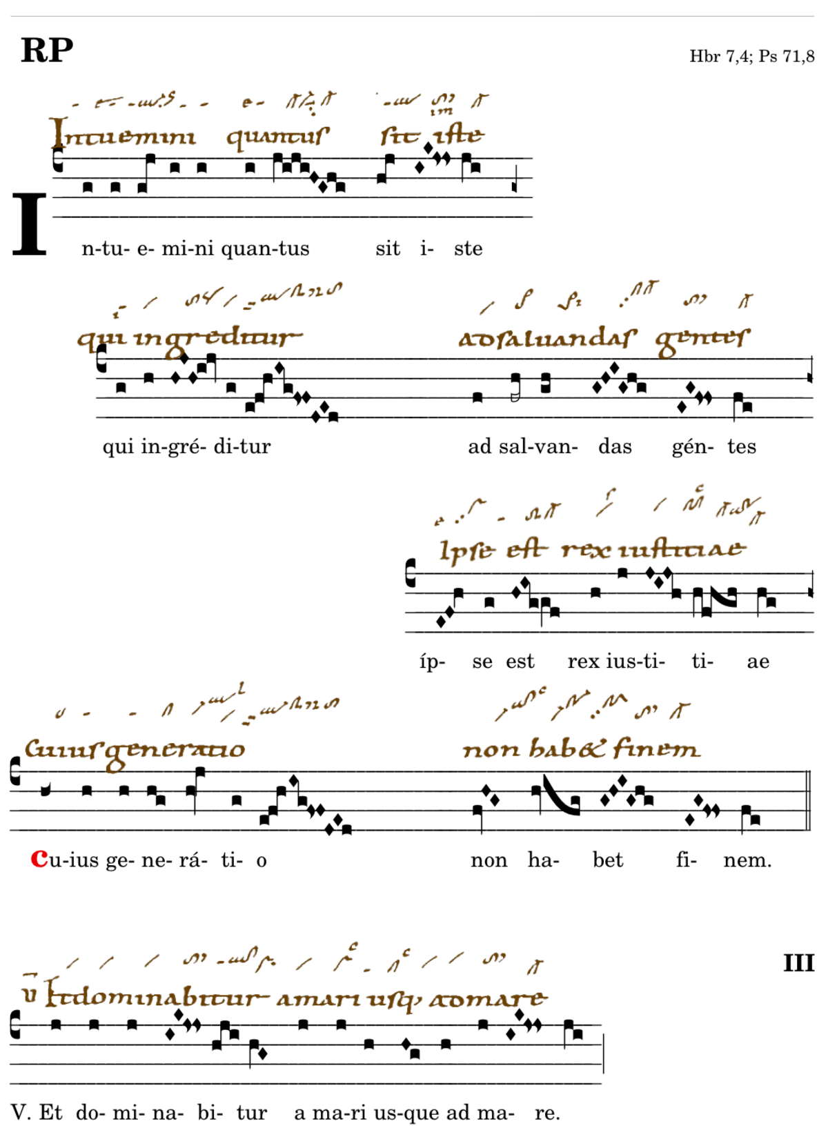 Intuemini quantus sit iste / qui ingreditur / ad salvandas gentes / ipse est rex iustitiae / 📍cuius generatio / non habet finem / V. Et dominabitur a mari usque ad mare. (omnes) V. Praecursor pro nobis ingreditur secundum ordinem melchisedech pontifex factus est in aeternum.