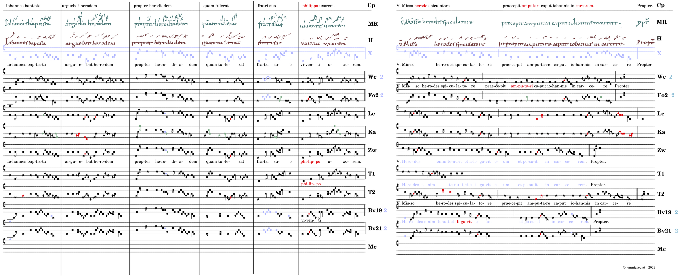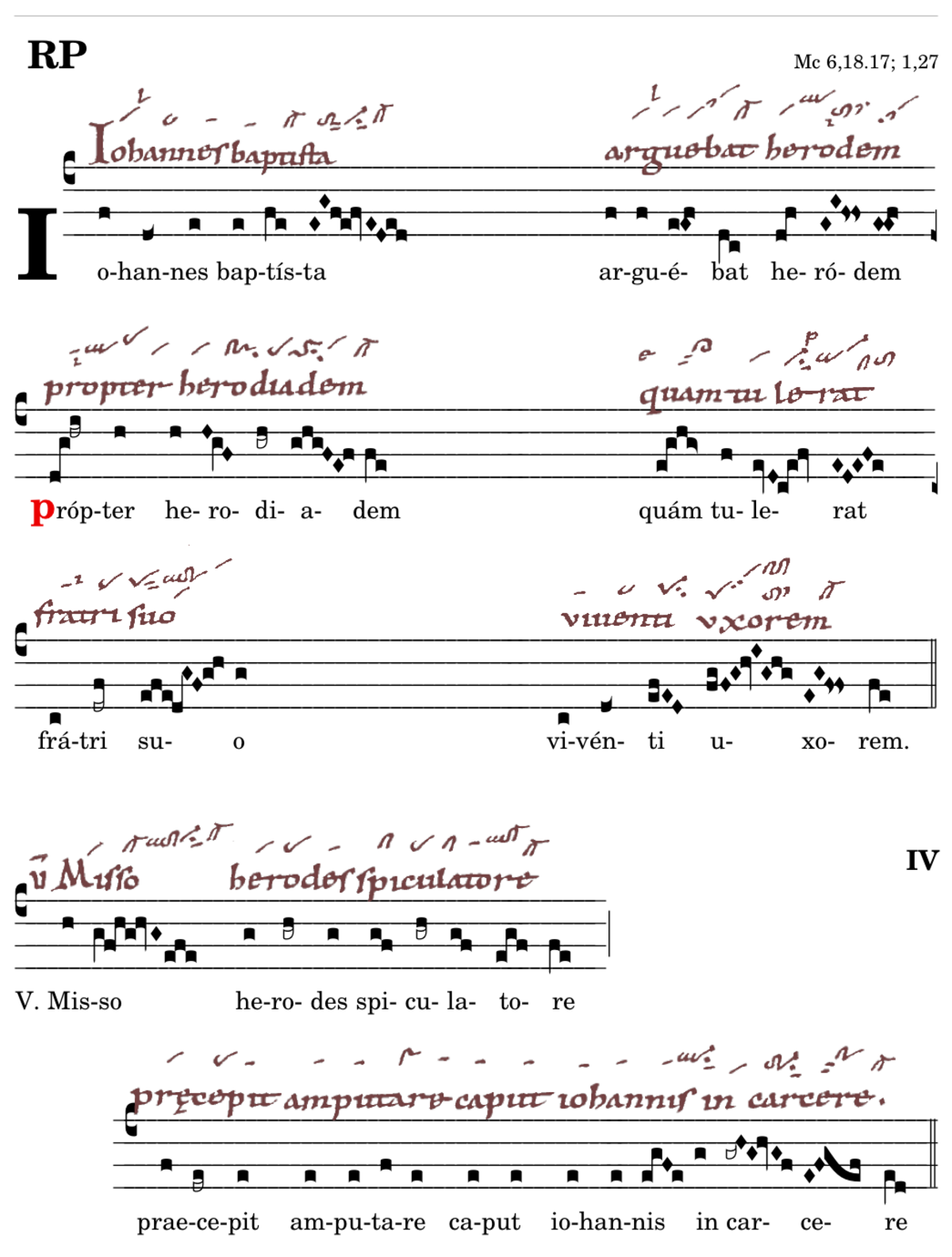Iohannes baptista / arguebat herodem / 📍Propter herodiadem / quam tulerat / fratri suo / viventi (philippi) uxorem. V. Misso herodes spiculatore* praecepit amputare caput iohannis in carcere. (Tol,Bv) V. Herodes enim tenuit et ligavit eum et posuit in caarcerem.