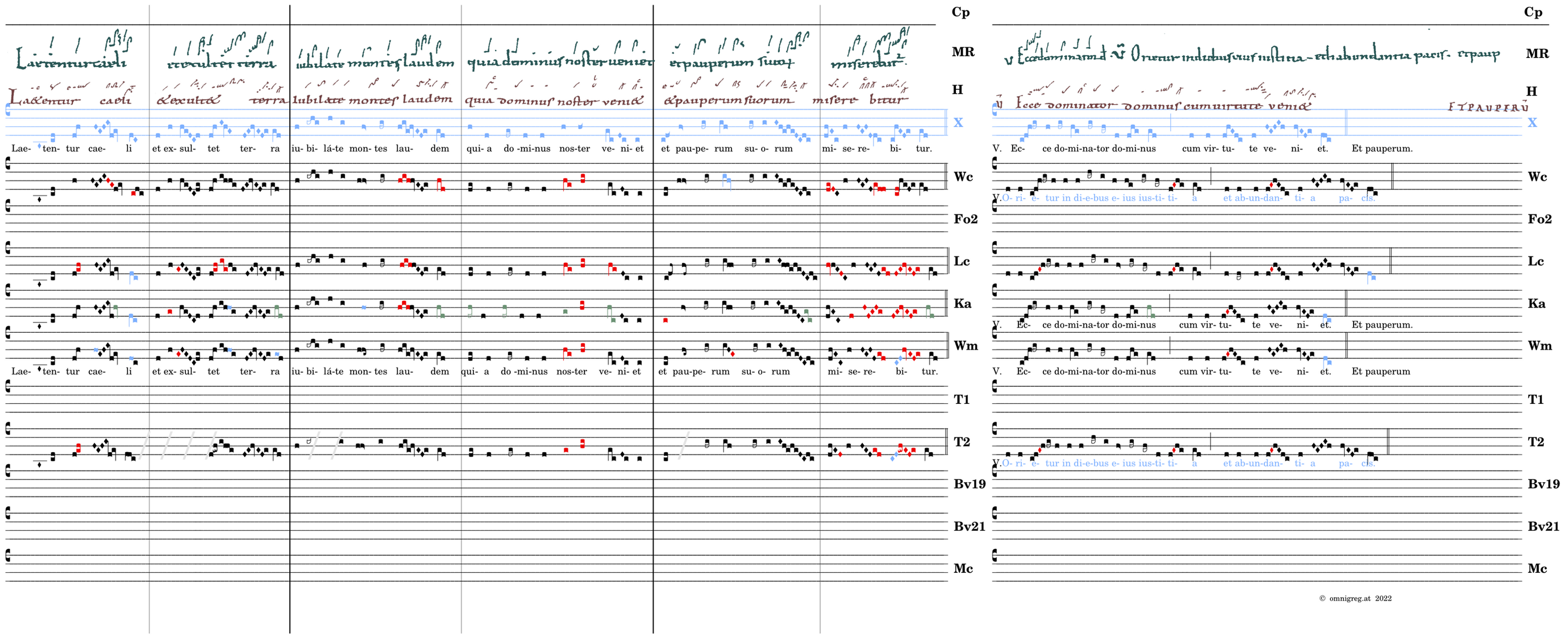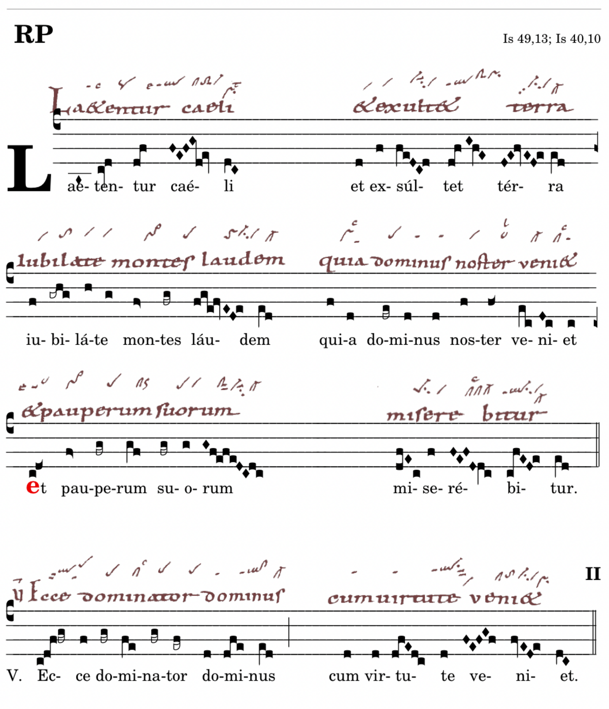 Laetentur caeli / et exultet terra / iubilate montes laudem / quia dominus noster veniet / 📍et pauperum suorum / miserebitur. V. Ecce dominator dominus* cum virtute veniet.. (MR,Wc,Lc,Tol) V. Orietur in diebus eius iustitia et abundantia pacis.
