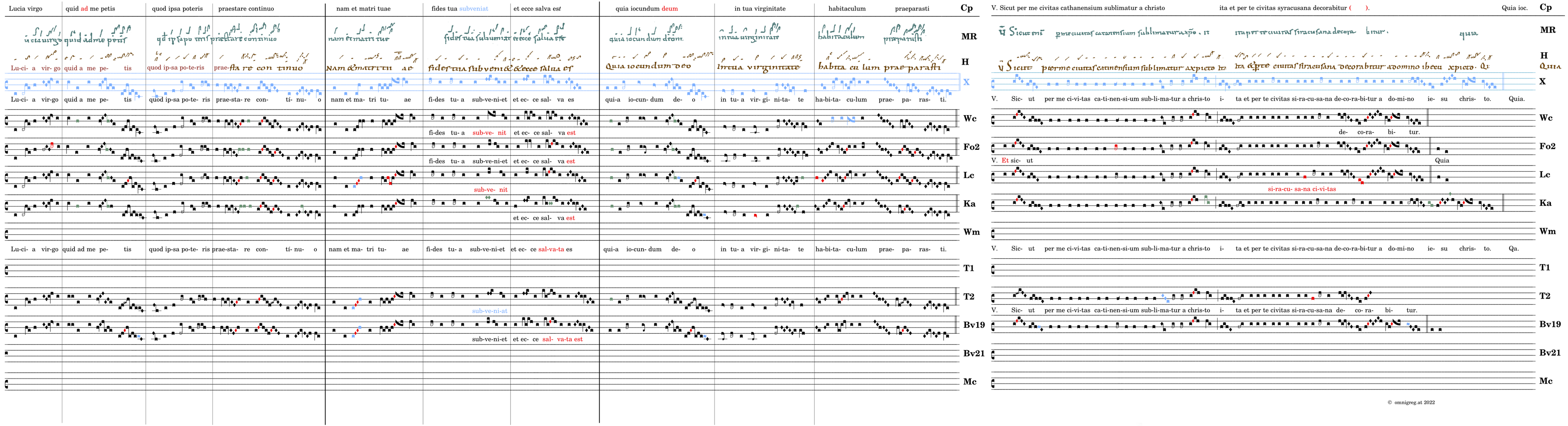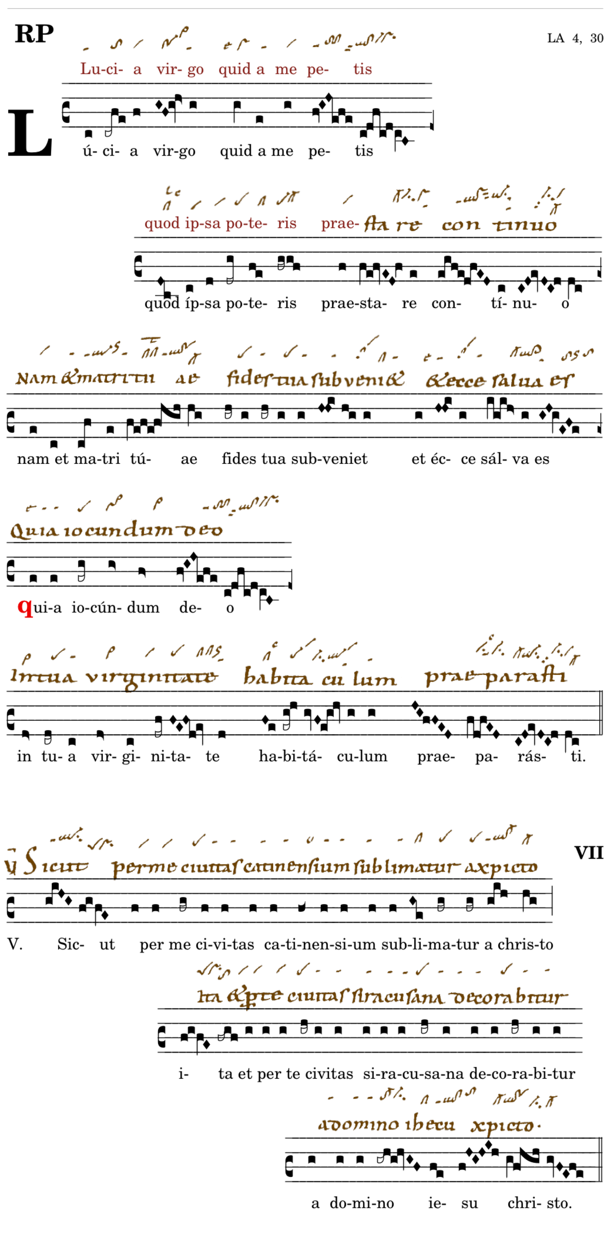 Lucia virgo / quid a me petis / quod ipsa poteris / praestare continuo / nam et matri tuae / fides tua subveniet (-subveniat) / et ecce salva(ta) es(t) 📍Quia iocundum deo / in tua virginitate / habitaculum praeparasti. V. Sicut (enim) per me civitas catinensium sublimatur a christo* ita et per te civitas siracusana decorabitur (a domino iesu christo).
