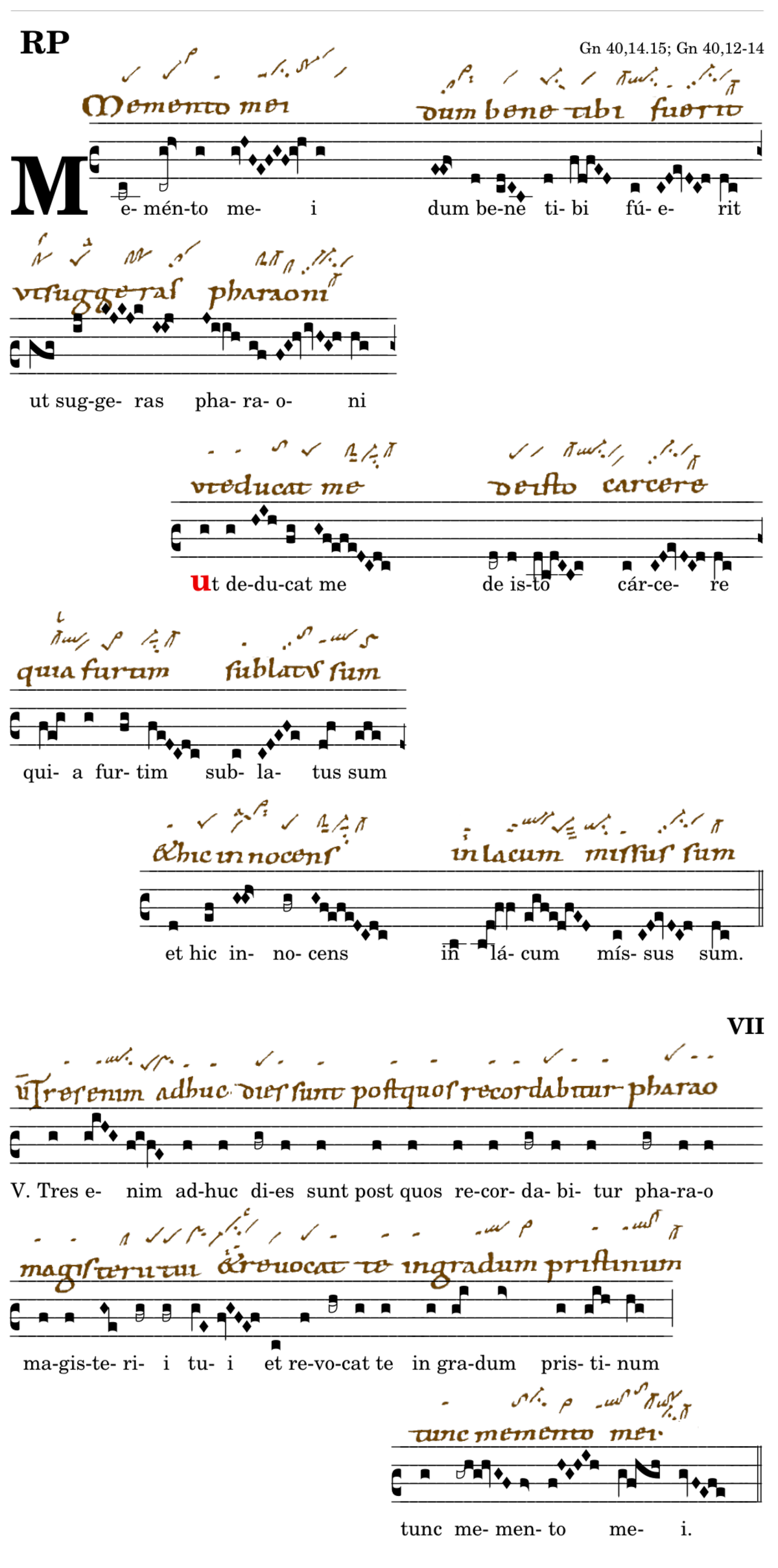 Memento mei / dum bene tibi fuerit / 📍Ut suggeras pharaoni / ut deducat me / de isto carcere / quia furtim sublatus sum / et hic innocens / in lacum missus sum. V. Tres enim adhuc dies sunt / post quos recordabitur pharao magisteri (-ministerii) tui / et revocat (-restituet) te in gradum pristinum* tunc memento mei.