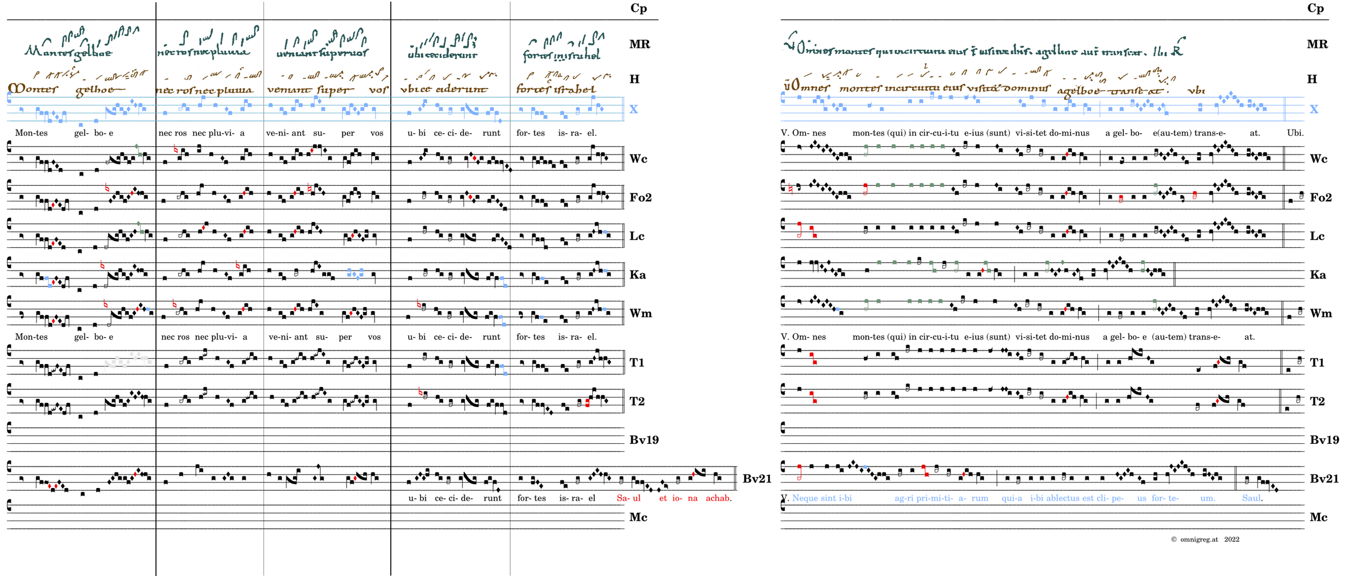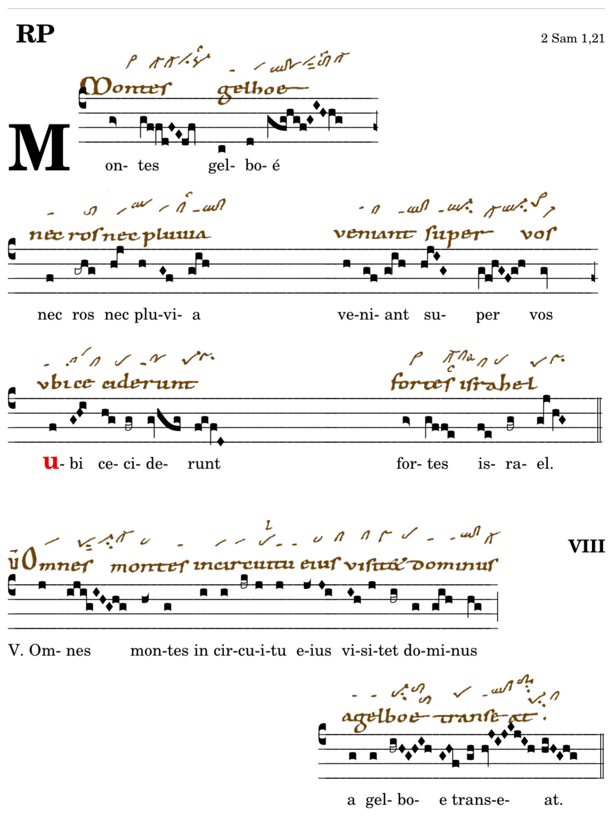 Montes gelboe nec ros nec pluvia veniant super vos 📍Ubi ceciderunt sortes israel. V. Omnes montes in circuitu eius (sunt) visitet dominus a gelboe (autem) transeat. (Tol) V. Omnes montes qui estis in circuitu eius visitet dominus a gelboe transeat. (Bv2) ... ubi ceciderunt fortes israel Saul et iona et achab. V. Neque sint ibi agri primitia tui quia ibi ablectus est clipeus forteum. Saul.