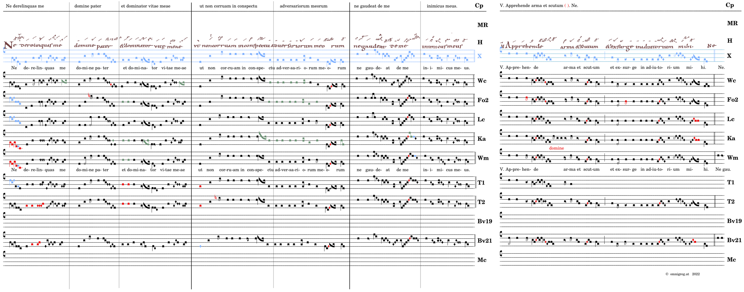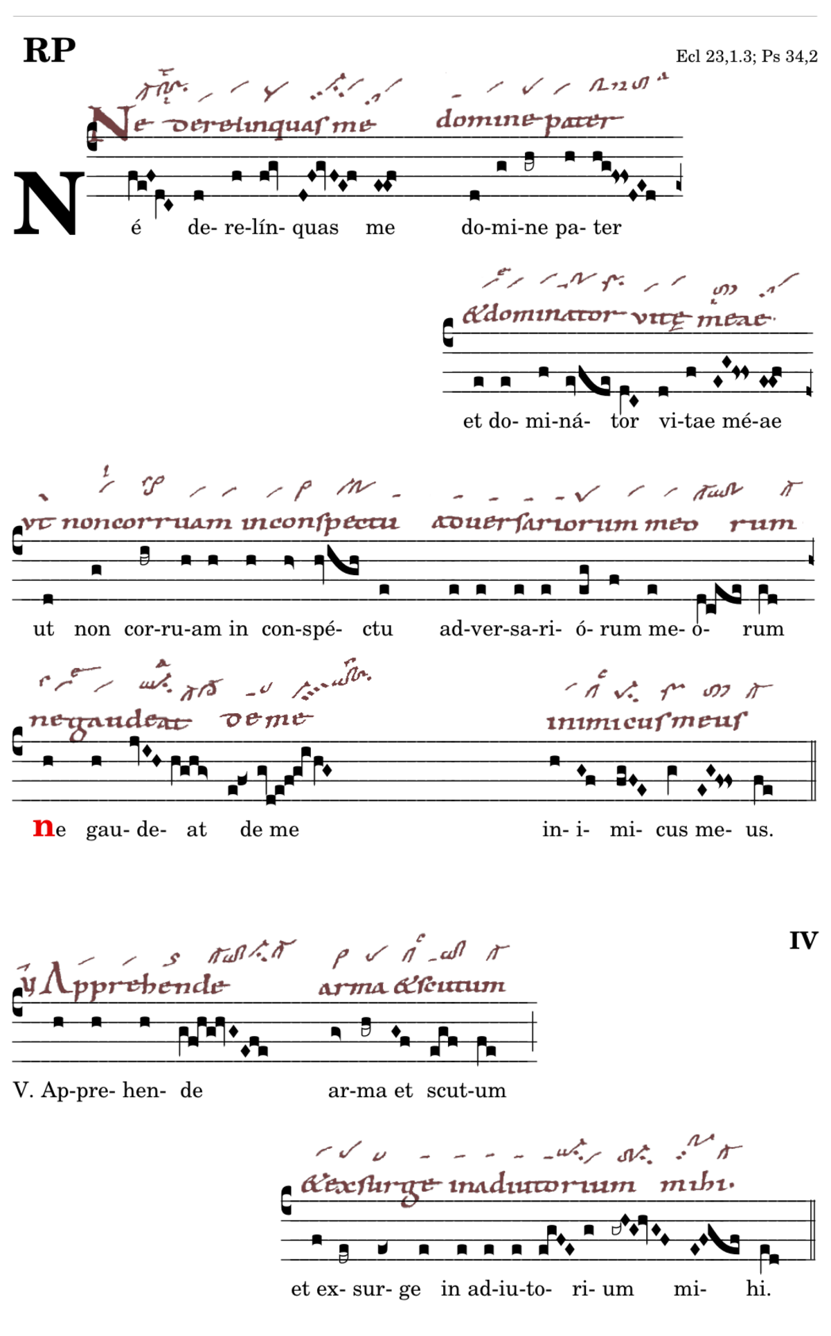 Ne derelinquas me / domine pater / et dominator vitae meae / ut non corruam in conspectu / adversariorum meorum / 📍ne gaudeat de me / inimicus meus. V. Apprehende (domine) arma et scutum* et exsurge in adiutorium mihi.