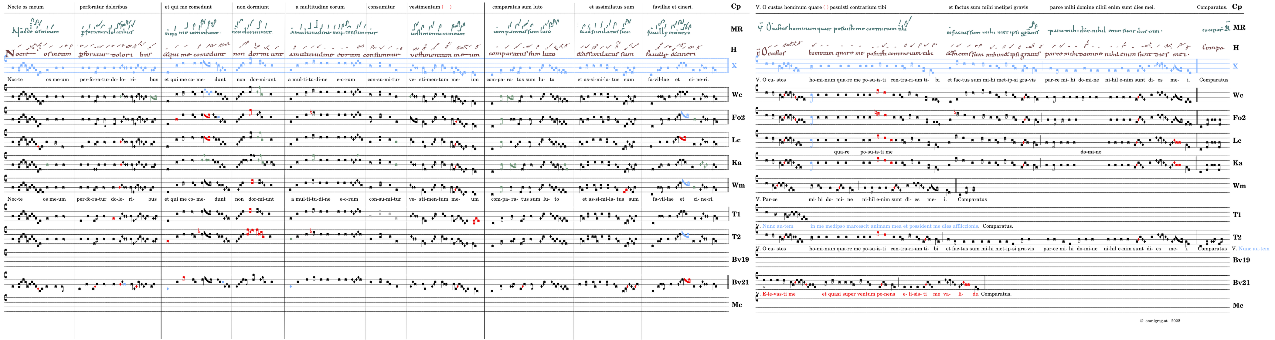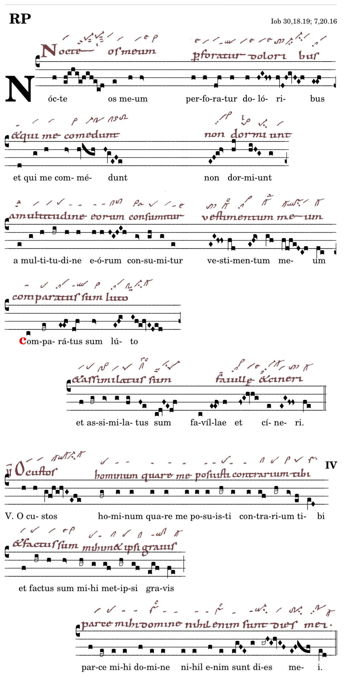 Nocte os meum / perforatur doloribus / et qui me comedunt / non dormiunt / a multitudine eorum / consumitur / vestimentum (meum) / 📍comparatus sum luto / et assimilatus sum / favillae et cineri. V. (O custos hominum quare (me) posuisti contrarium tibi et factus sum mihi metipsi gravis* ) parce mihi domine nihil enim sunt dies mei. (T1,T2+) V. Nunc autem in me metipso marcescit anima mea et possident me dies affliccionis. (Bv2) V. Elevasti me et quasi super ventum ponens elisisti me valde.
