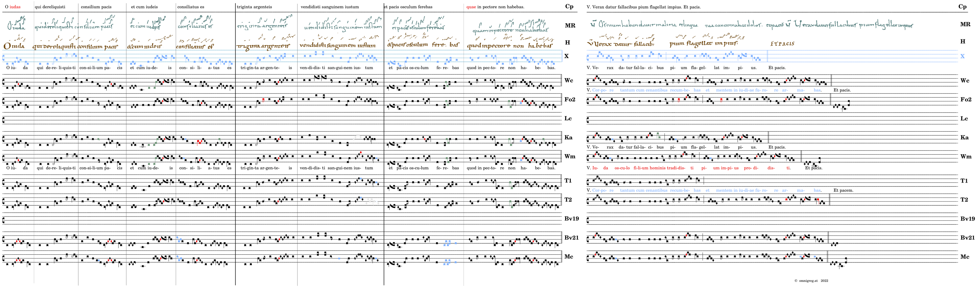 O iuda / qui dereliquisti / consilium pacis / et cum iudeis / confiliatus es / triginta argenteis / vendisti sanguinem iustum / 📍Et pacis (-pacem) osculum (-o) ferebas / quod (-quam) in pectore non habebas. V. Verax datur fallacibus* pium flagellat impius. (MR) +V.Os tuum habundavit malitia et lingua tua concannabat dolos. (Wc,Fo2,Tol) V.Corpore tantum cum cenantibus (T1:-canentibus) recumbebas / et mentem in iudiae furore armabas.