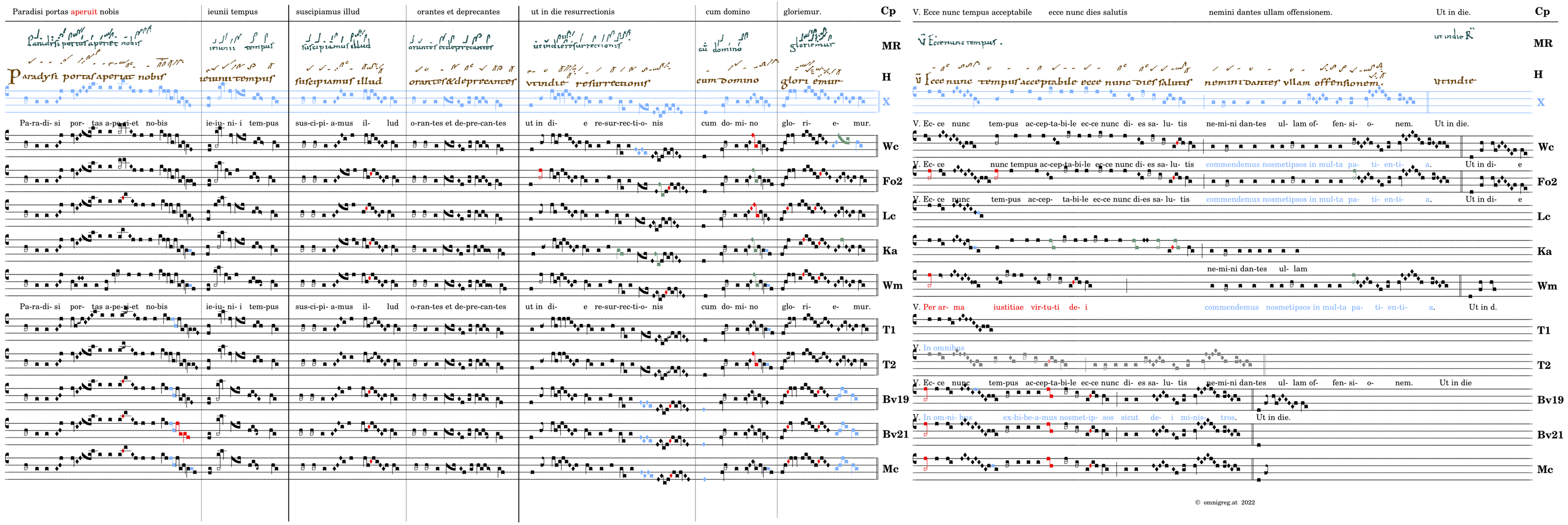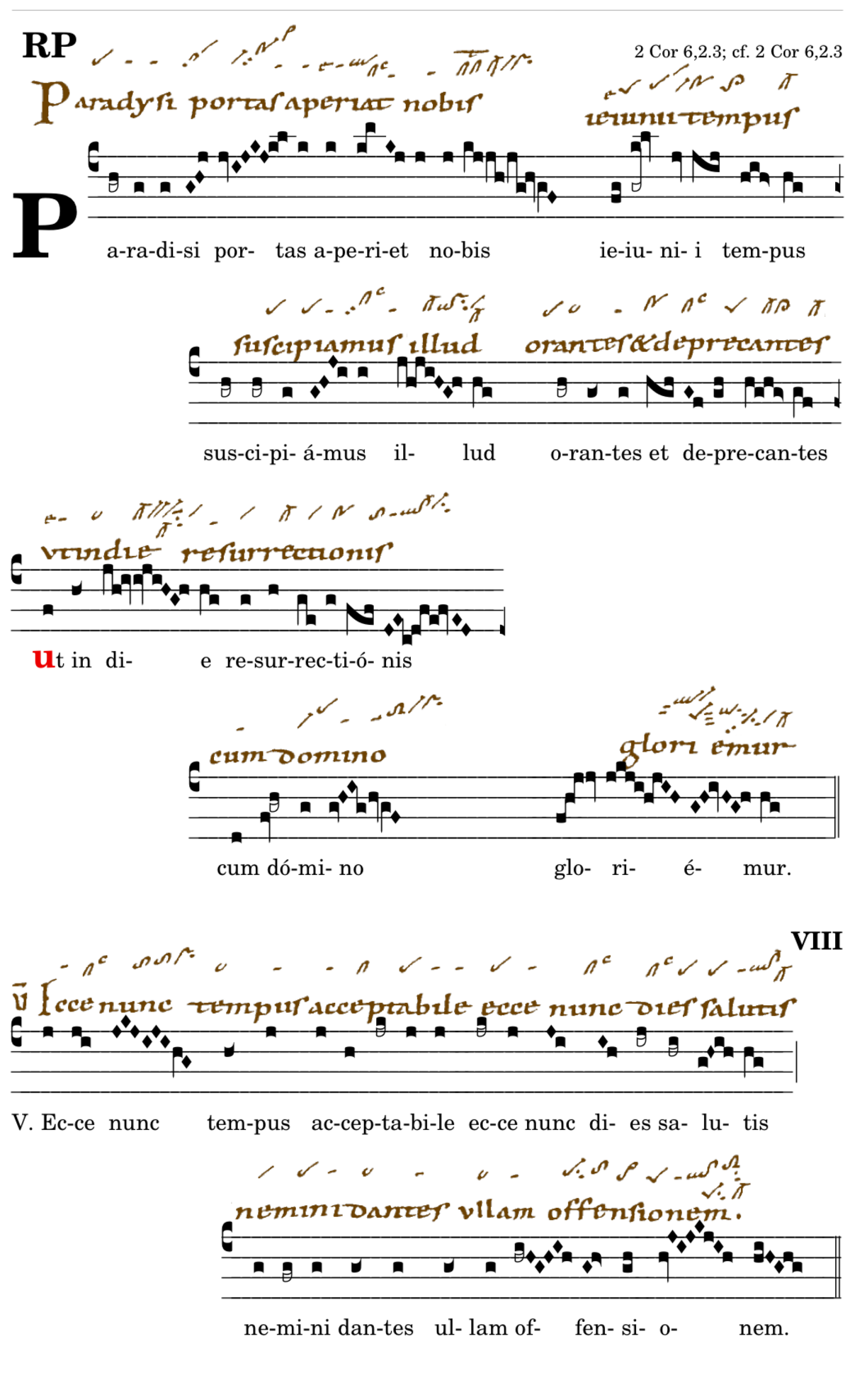 Paradisi portas aperiet nobis / ieunii tempus / suscipiamus illud (-Bv,Mc: ipsum) / orantes et deprecantes / 📍Ut in die resurrectionis / cum domino / gloriemur. V. Ecce nunc tempus acceptabile ecce nunc dies salutis* nemini dantes ullam offensionem. (Wc,Fo2) V. Ecce nunc tempus acceptabile / ecce nunc dies salutis / commendemus nosmetipsos in multa patientia. (Wm) V. Per arma iustitiae virtuti dei commendemus nosmetipsos in multa patientia. (Bv,Mc) V. In omnibus exhibeamus nosmetipsos sicut dei ministros (in multa patientia).