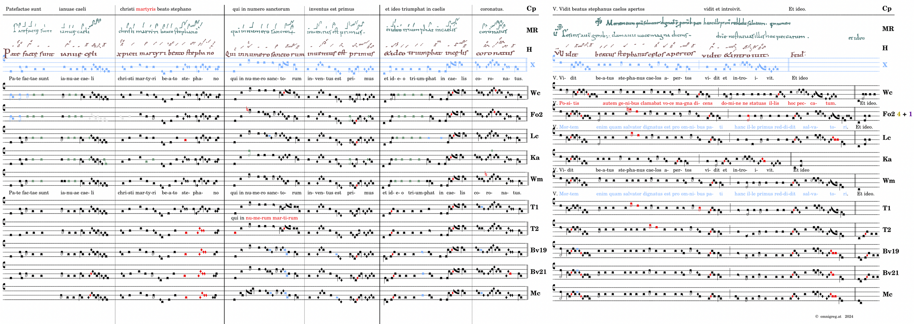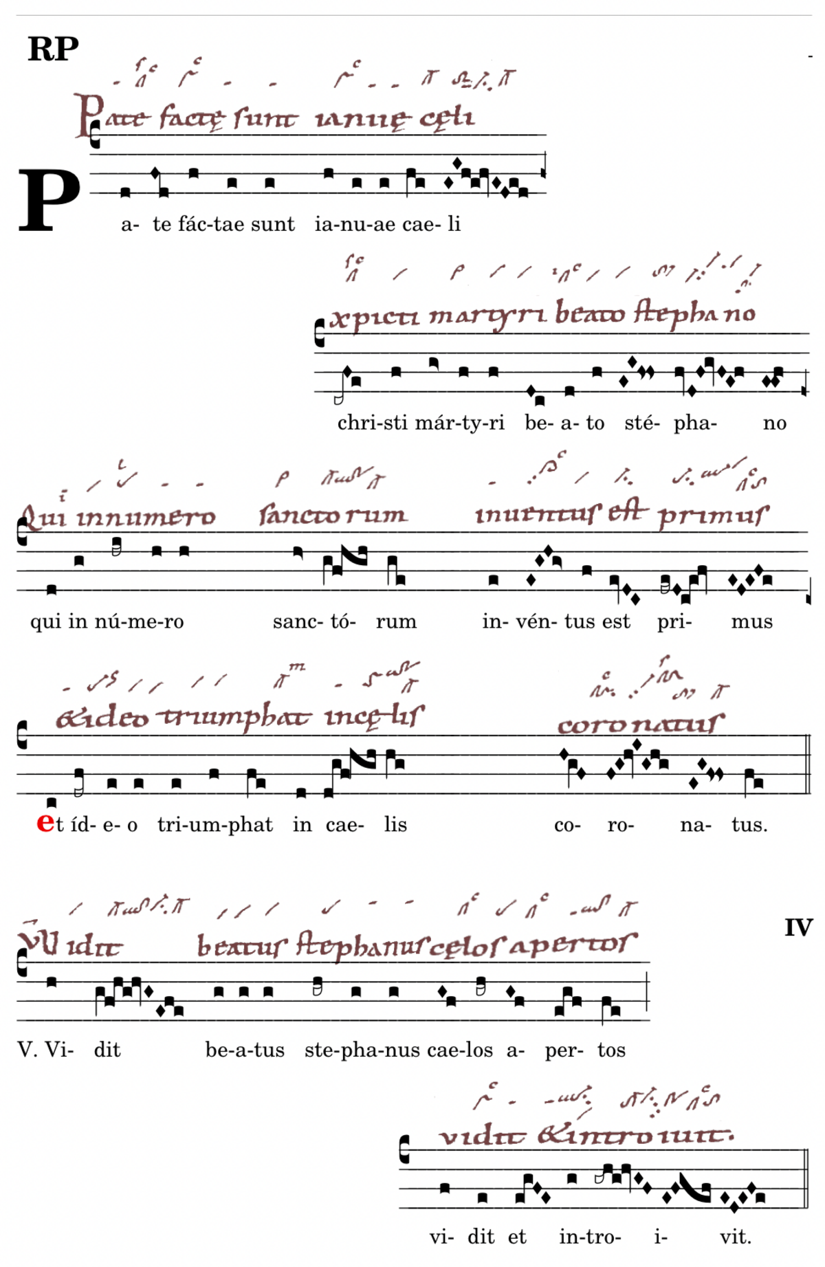 Patefactae sunt ianuae caeli / christi martyri beato stephano / 📍qui in numero sanctorum (-martirum) / inventus est primus / 📍Et ideo triumphat in caelis / coronatus. V. Vidit beatus stephanus caelos apertos* vidit et introivit. (MR,Wc) V. Positis autem genibus clamabat voce magna dicens domine ne statuas illis hoc peccatum. (omnes) V. Mortem enim quam salvator dignatus est pro omnibus pati hanc ille primus reddidit salvatori.