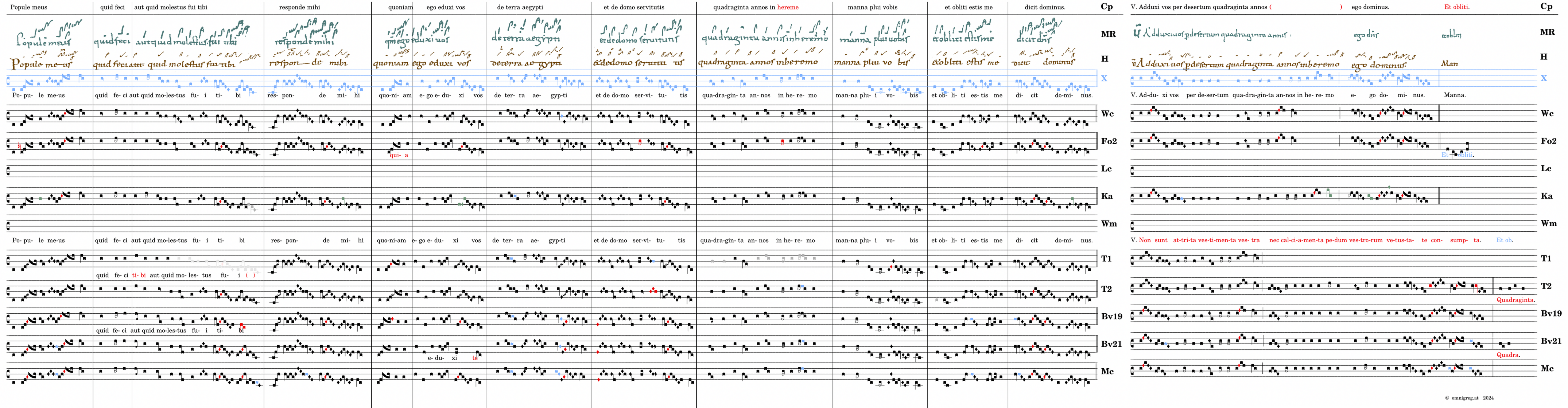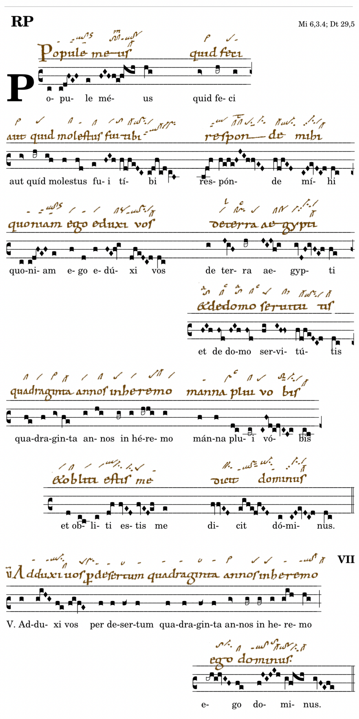 Popule meus / quid feci (tibi) aut quid molestus fui (tibi) / responde mihi / quoniam / ego eduxi vos / de terra aegypti / et de domo servitutis / 📍quadraginta annos in heremo 📍manna plui vobis / 📍et obliti estis me / dicit dominus. V. Adduxi vos per desertum quadraginta annos in heremo* ego dominus. (Tol,Bv,Mc) V.Non sunt attrita vestimenta vestra nec calciamenta pedum vestrorum vetustate consumpta.