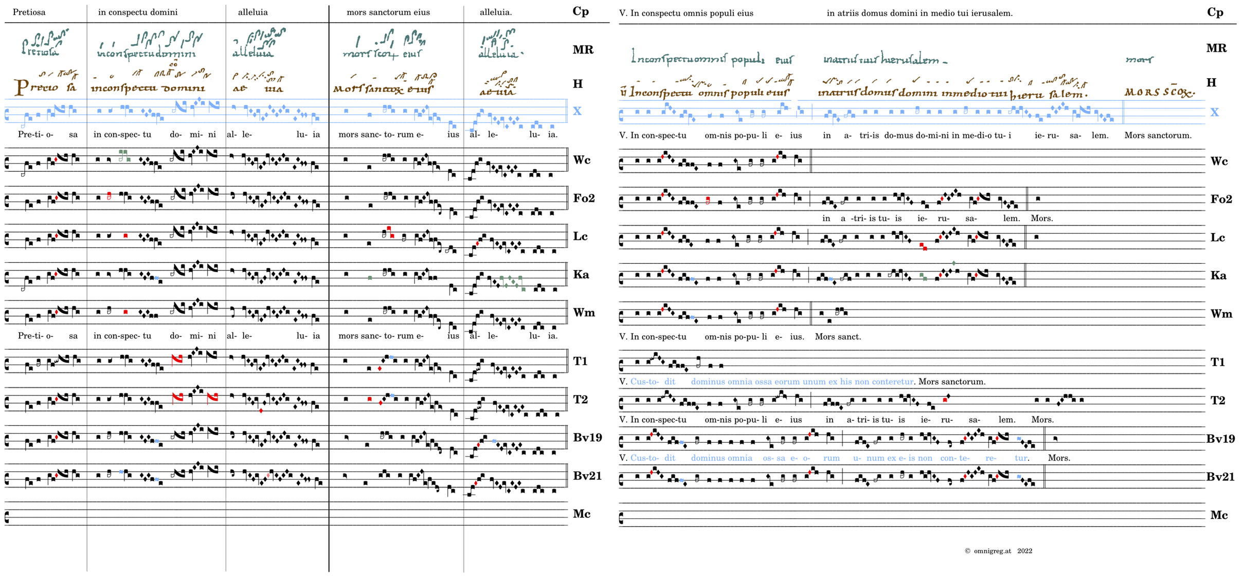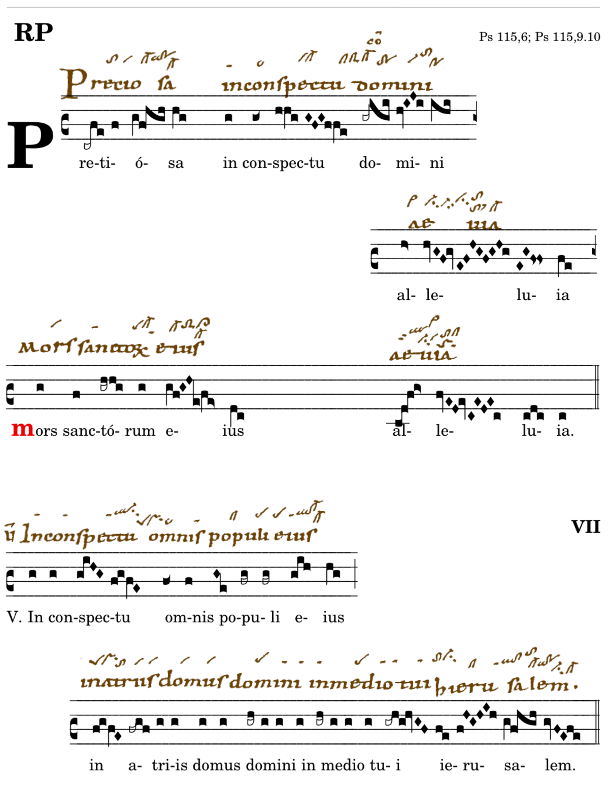 Pretiosa / in conspectu domini / alleluia / 📍Mors sanctorum eius / alleluia. V. In conspectu omnis populi eius* in atriis domus domini in meio tui (-in atriis tuis) ierusalem. (T1,Bv) V.Custodit dominus omnia ossa eorum unum ex eis non contere(n)tur.