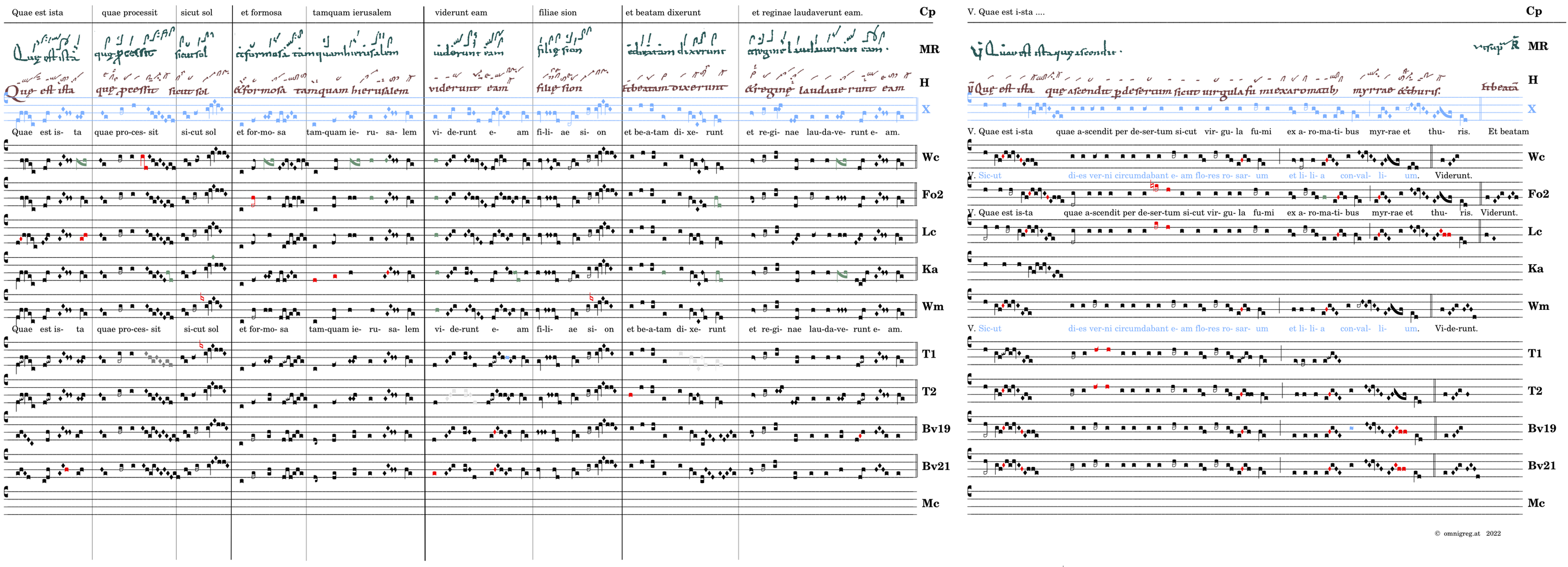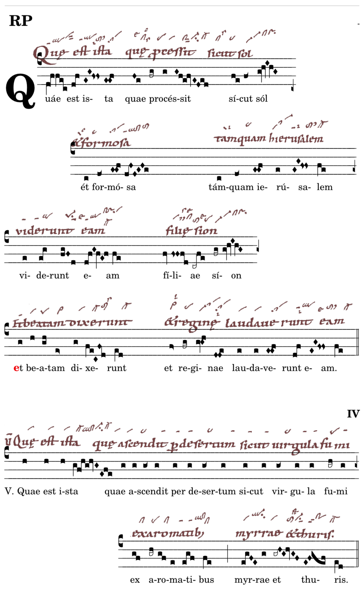 Quae est ista / quae processit / sicut sol / et formosa tamquam / ierusalem / 📍viderunt eam / filiae sion 📍Et beatam me dixerunt / et reginae laudaverunt eam. V. Quae est ista quae ascendit per desertum sicut virgula fumi ex aromatibus* myrrae et thuris (Wc,Tol,Wm,Bv) V. Sicut dies verni circumdabant eam flores rosarum et lilia convallium.