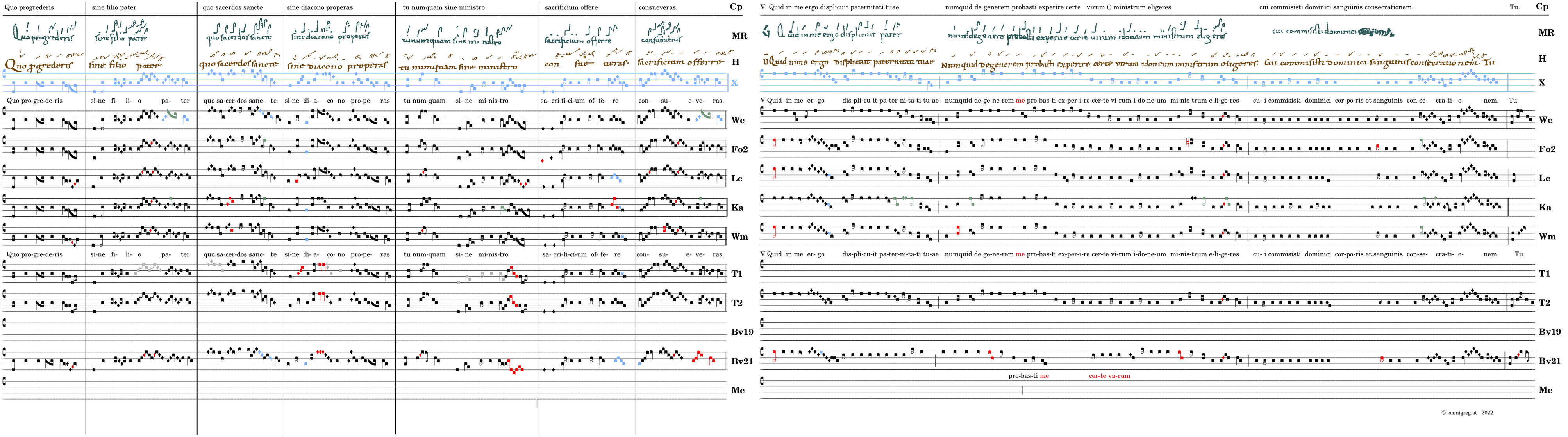 Quo progrederis / sine filio pater / quo sacerdos sancte / sine diacono properas / 📍Tu numquam sine ministro / sacrificium offere / consueveras. V. Quid in me ergo displicuit paternitati tuae . numquid de generem probasti experire certe . virum idoneum ministrum eligeres (-eligeres)* cui commisisti dominici sanguinis consecrationem. (MR) V. Quid in me ergo displicuit pater () numquid de generem probasti experire certe virum idoneum ministrum eligeres cui commisisti dominici () (Wc) V. Quid in me ergo displicuit paternitati tuae / numquid de generem probasti experire certe virum idoneum ministrum elegeris / cui commisisti dominici corporis et sanguinis consecrationem. (Fo2,Lc) V. Quid in me ergo displicuit paternitati tuae / numquid de generem probasti experire certe virum idoneum ministrum elegeris / cui commisisti dominici sanguinis dispensationem.