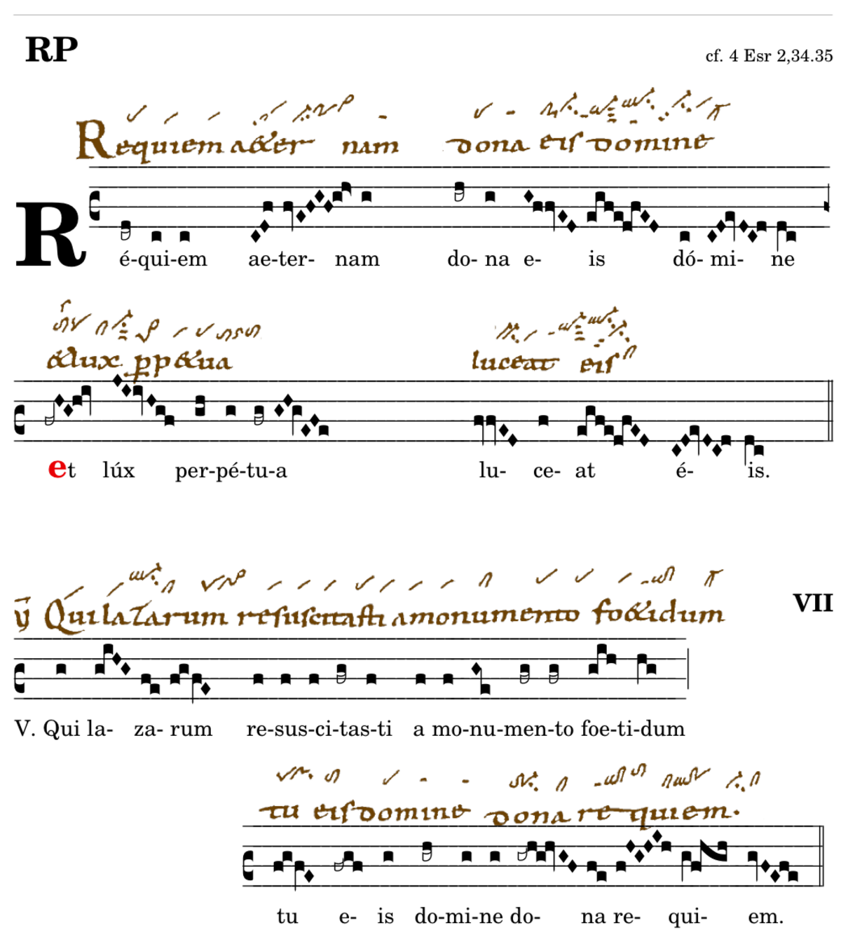 Réquiem aeternam / dona eis dómine / 📍Et lúx perpétua / luceat éis. V. Qui lazarum resuscitasti a monumento foetidum* tu eis domine dona requiem.