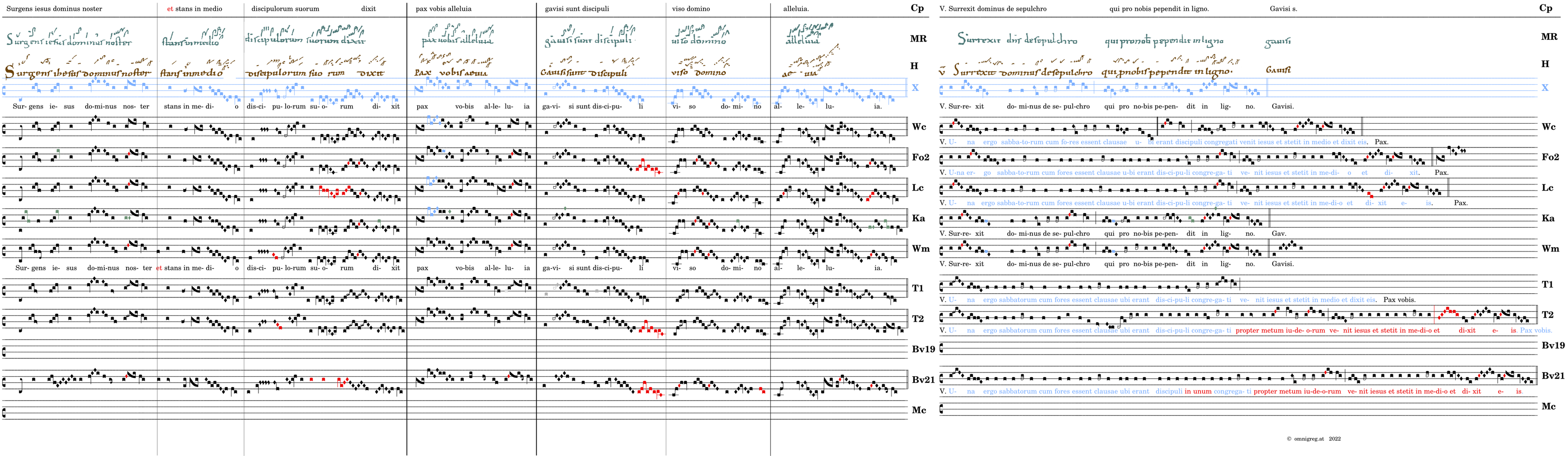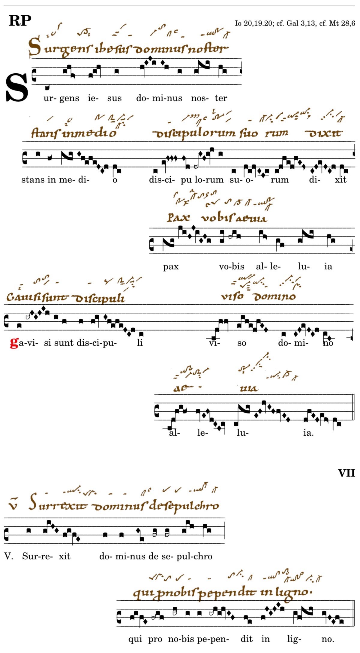 Surgens iesus dominus noster / stans in medio / discipulorum suorum dixit / 📍pax vobis alleluia / 📍Gavisi sunt discipuli / viso domino / alleluia. V. Surrexit dominus de sepulchro* qui pro nobis pependit in ligno. (Wc,Fo2,Lc,Tol,Bv) V.Una ergo sabbatorum / cum fores essent clausae ubi erant discipuli congregati (propter metum iudeorum) / venit iesus et stetit in medio et dixit eis