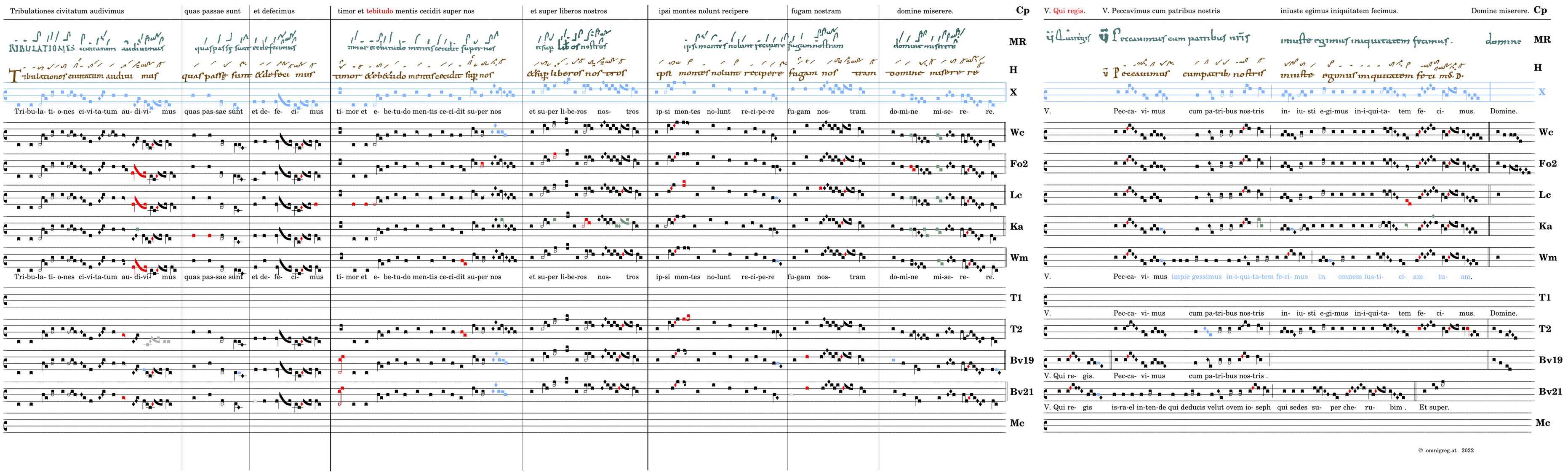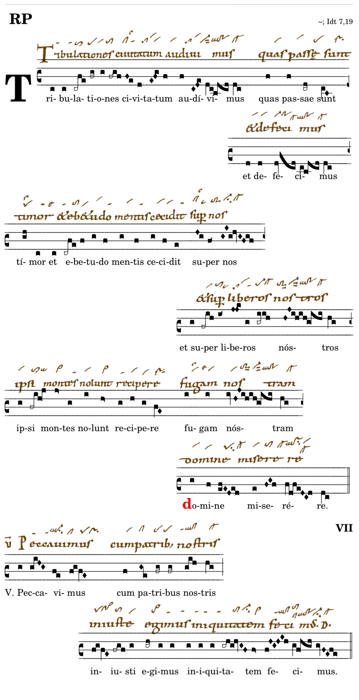 Tribulationes civitatum audivimus / quas passae sunt / et defecimus / timor et ebetudo meritis cecidit super nos 📍 et super liberos (Ka:-filios) nostros / ipsi montes nolunt recipere / fugam nostram 📍 Domine miserere. V. Peccavimus cum patribus nostris* iniusti egimus iniquitatem fecimus. (Wm) V.Peccavimus impie gessimus / iniquitatem fecimus in omnem iusticiam tuam. (MR,Bv) +V.Qui regis israel intende qui deducis velut ovem ioseph qui sedes super cherubim.