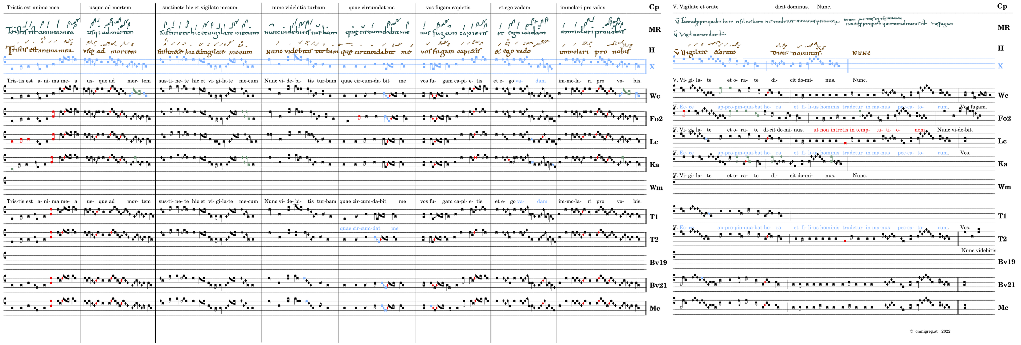 Tristis est anima mea / usque ad mortem / sustinete hic et vigilate mecum 📍Nunc videbitis turbam quae circumda(bi)t me 📍vos fugam capietis / et ego vado (- vadam) / immolari pro vobis. V. Vigilate et orate* dicit dominus (ut non intretis in temptationem). (omnes) V. Ecce appropinqua(bi)t hora et filius hominis tradetur in manus peccatorum.