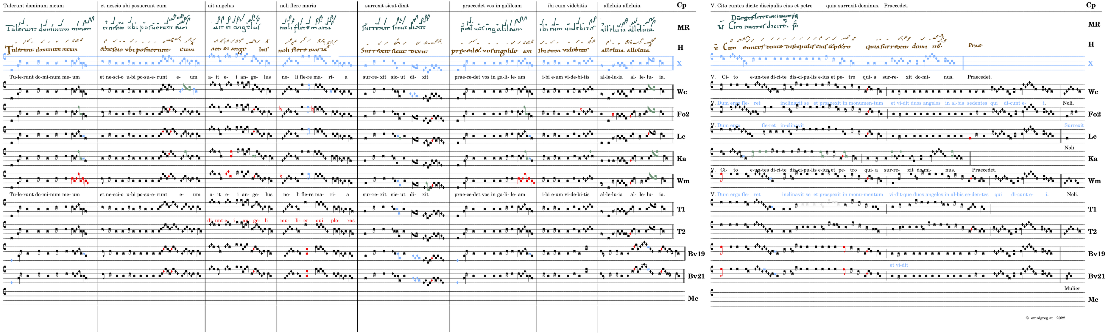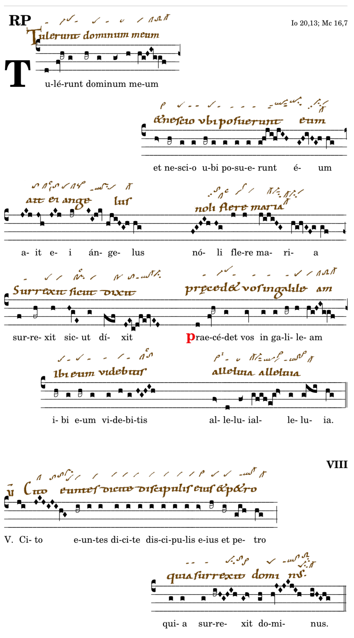 Tulerunt dominum meum / et nescio ubi posuerunt eum / ait ei angelus / noli flere maria (- Tol,Bv: dicunt ei angeli mulier quid ploras)/ surrexit sicut dixit 📍Praecedet vos in galileam / ibi eum videbitis / alleluia alleluia. V. Cito euntes dicite discipulis eius et petro* quia surrexit dominus. (omnes) V. Dum ergo fleret inclinavit se et prospexit in monumentum / et vidit duos angelos in albis sedentes qui dicunt ei.