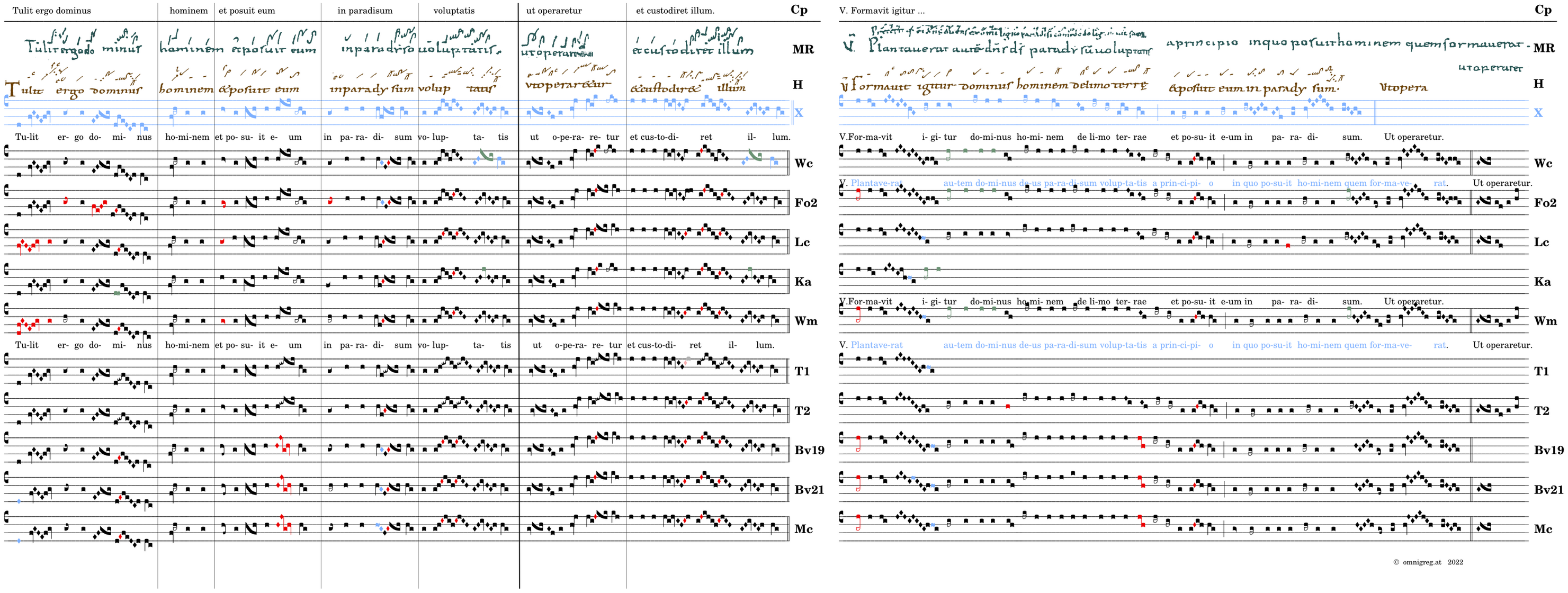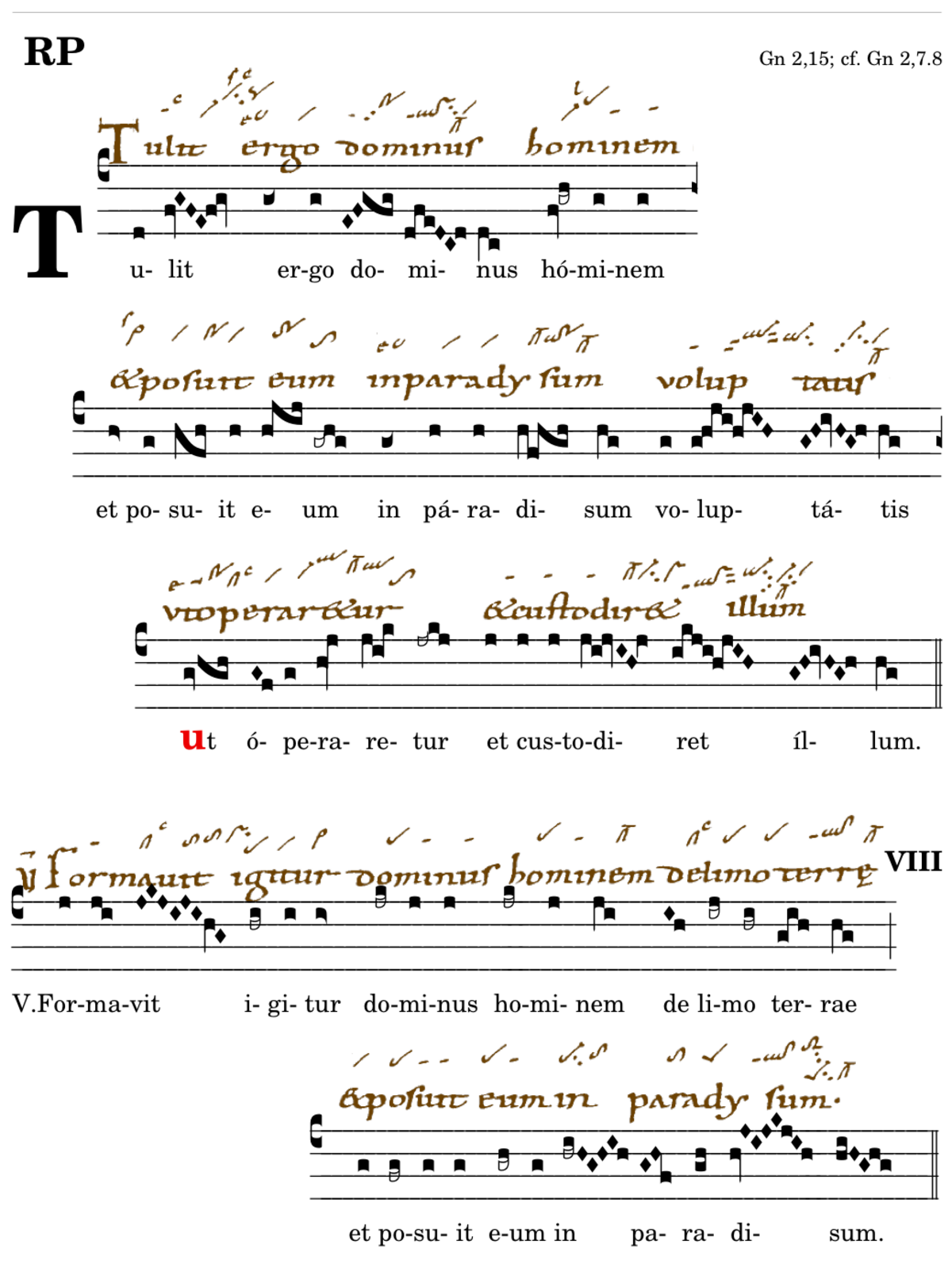 Tulit ergo dominus hominem / et posuit eum in paradisum voluptatis (-T1,Bv2: voluntatis) 📍Ut operaretur et custodiret illum. V. Formavit igitur dominus hominem /de limo terrae / et posuit eum in paradisum. (omnes) V. Plantaverat autem dominus deus paradisum voluptatis (-T1: voluntatis) a principio / in quo posuit hominem quem formaverat.