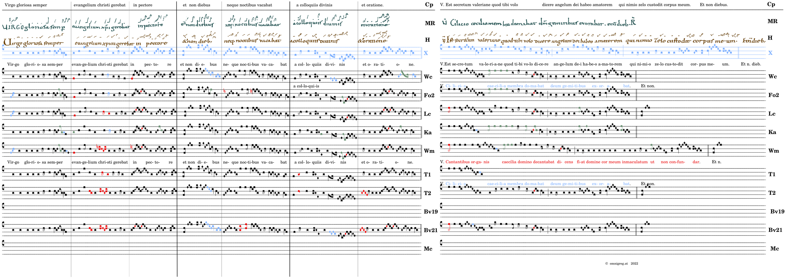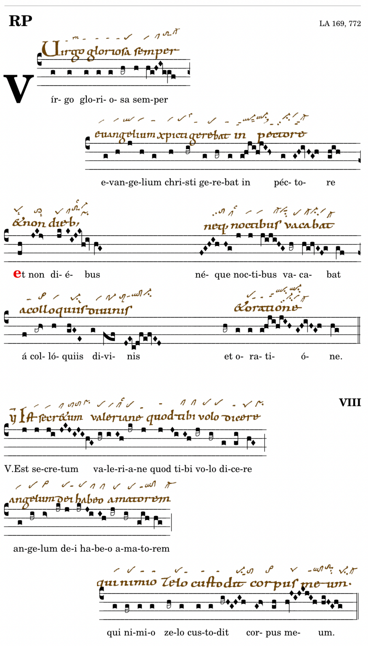 Virgo gloriosa (Bv2: -caecilia) semper / evangelium christi gerebat in pectore / 📍Et non diebus / neque noctibus vacabat / a colloquis divinis / et oratione. V. Est secretum valeriane quod tibi volo dicere . angelum dei habeo amatorem* qui nimio celo custodit corpus meum. (Wm) V. Cantantibus organis caecilia domino decantabat / dicens fiat domine cor meum inmaculatum ut non confundar. (omnes) V. Cilicio caecilia membra domabat deum gemitibus exorabat.