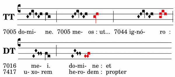 Soll eine CAD-Formel nicht wirklich abschließen, sondern fragend enden, oder doch nach der Frage weiterführen, so wird im DT die Clivis fa-mi zum Pes mi-fa (strophisch mi-mi-fa; vulgo: Einklangsscandicus) umgewandelt e.g.: 7002 „omnis terra :“, 7417 „herodem :“. Ähnlich wird in den anderen Tonalitäten die Clivisbewegung umgedreht, (z.B. TT la-sol zu sol-la) e.g.: 7005 „meos :“ oder zum ScaFlx weitergeführt (sol-la-si-la) e.g.: 7044 „ignoro :“, 7003 „levavi:“.