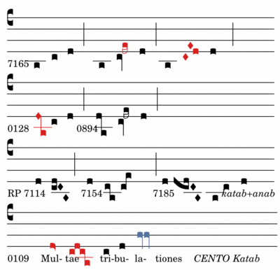 Ausgangspunkt der Katabasis ist das grundsätzlich unbetonte aufsteigende Incipit des Protus ”La-do-re“. Dem “do“ kann ein Akzentpes aufgesetzt sein („re-mi“) oder es kann durch Trc GRAV („do-mi-re) ersetzt sein. Das “La“ kann verstärkt werden, indem es mit „re“ zur Clivis „re-La“ erweitert wird. Damit ist der Weg geebnet für den absteigenden Gebrauch der Katabasis: „re-do-La“ (0153 “Terriblis“) und des PesSbp “(0163 „do-re-do-La“ „Vultum“). Durch Trennung und Verbindung (Diärese und Krasis) der Neumen je nach Textsituation, werden vielfältige Varianten möglich. Ebenso bieten Kurrenz und Nicht-Kurrenz zusätzliche Modifizierungen der Katabasis. Der Vergleich macht offensichtlich, dass die Liqueszenz ein Auslassungszeichen ist.