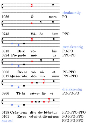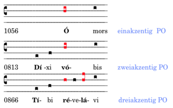 Bei dreiakzentigen Texten bleiben die „praetonischen“ Töne beim ersten Akzent, der zweite Akzent liegt samt seinen posttonischen Silben auf „do“, der dritte Akzent steigt zum „mi“ (nkPes „do-mi“), die Endsilbe geht wie in allen Fällen zum „re“.
