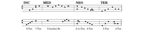 QNOV Rückführung zum do über den Quartsprung la-re, das re wird nie akzenttragend. Modal ist die Terz la-do konstitutiv (PR: 1. und/oder 2. Modus). Der Abstieg zum durch Wiederholung bestätigten sol wendet die Tonalität zurück zum Tetrachord (8. Ton, do-si-la-sol).