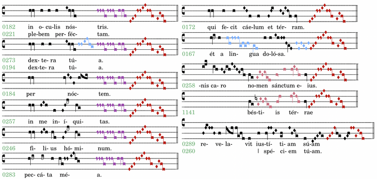 Sechsmal wird keines der beiden Final-Melismata verwendet und auch kein Melisma als Incipit-Formel, obwohl der Hauptakzent hier am Beginn des Cento liegt. In