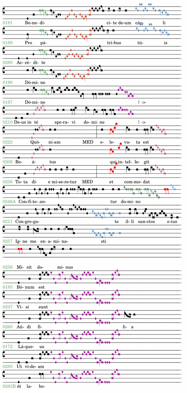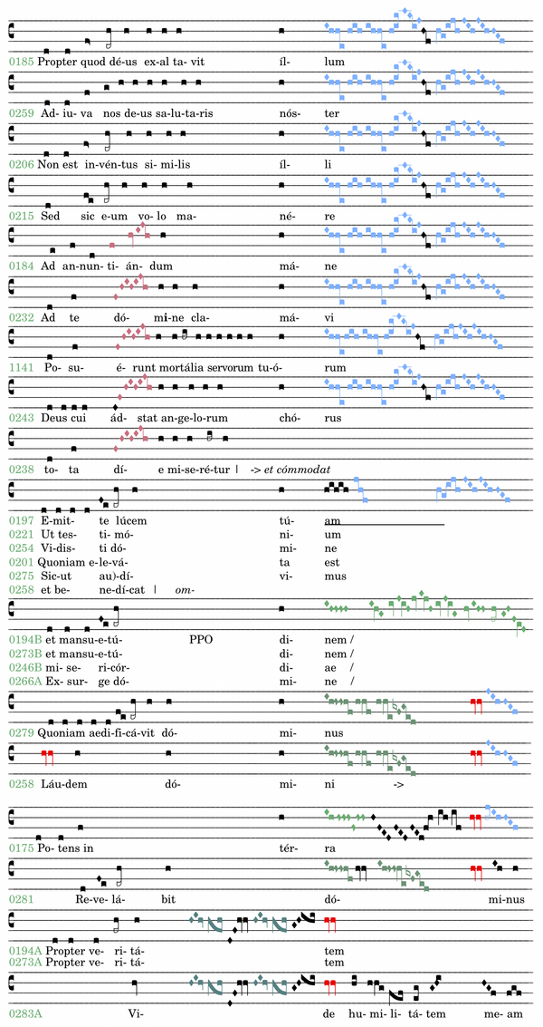 Urbild für diesen Cento ist ebenfalls das GR 0185 „Christus factus est“. Diese Melodie wird dreimal wiederholt (0206, 0215, 0259). In 0259 ist die Melodie um den markanten zweimaligen Aufstieg „fa-la-do“ erweitert, der selbst bei gewichtigen Texten fünf weitere Male verwendet wird.