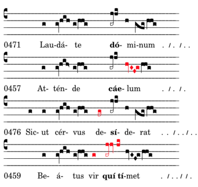 IM TR Laudate dominum 0471 wird der Anfang des Melismas individuell abgewandelt um den Text auszudeuten: Der „lapis preti-ó-sus“ verwandelt die kurrente Gruppe Porrectus subpunctis (Prrsbp) mit strophischer Endamplifikation in einen Pessbp (5tonig), dem dem „Edel-stein“ eher gerecht wird.