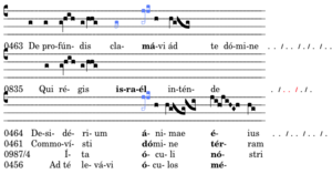 IM TR Laudate dominum 0471 wird der Anfang des Melismas individuell abgewandelt um den Text auszudeuten: Der „lapis preti-ó-sus“ verwandelt die kurrente Gruppe Porrectus subpunctis (Prrsbp) mit strophischer Endamplifikation in einen Pessbp (5tonig), dem dem „Edel-stein“ eher gerecht wird.