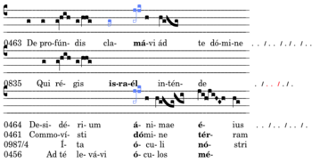 Auch bei zwei Akzenten kann diese unübliche Akzentsituation auftreten und auf den zweiten Akzent vier und mehr ungetonte Silben das Ende bilden „-se--re no-bis“ 0456, „-mus ís-ra-el est“ 0478. In diesen Fällen eröffnet die letzte Silbe das Melisma. Folgen dem letzten Akzent wie üblich nur eine oder zwei unbetonte Silben, so eröffnet der letzte Akzent das Melisma. Die posttonische(n) Silbe(n) verändern die Melodie des zweiten Melismateiles nur leicht, aber auffällig.