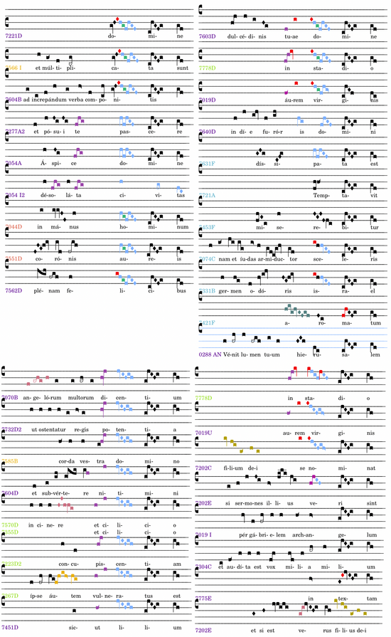 Unter 'non typos' gelistete Centones sind nicht unter die Formeln von RP1 D zuzuordnen. Was auffällt ist das häufige Auftreten des TrcSEF auf verschiendenen Tonstufen.