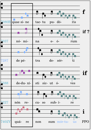 • Um einen leichteren Überblick zu ermöglichen ist in den Tabellen der Unterschied zwischen PO und PPO nicht in den Neumen dargestell. Die blaue Farbe des Textes drückt PPO aus, bei PO bleibt der Text schwarz.