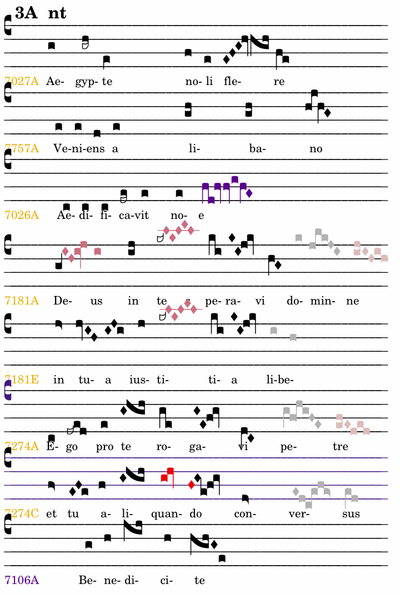 Das hauptsächliche Incipit des 3. Modus Clv „mi-re“-„sol“ und weiterer Aufstieg zu „la“und „si“ wird 15x verwendet. Es ist offensichtlich: der Cephalicus auf der ersten Silbe an Stelle der Clv kann nicht bedeuten: „Singe den zweiten Ton der Clv etwas weniger“ (wozu, wie viel weniger?), sondern zeigt an, dass der hier übliche zweite Ton der Clv entfällt, die verbindende Funktion der Clv hier nicht gewollt ist.
