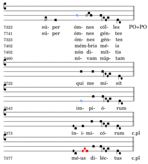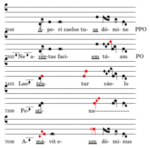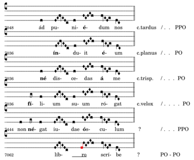 Das Medium besteht grundsätzlich aus Pes-Clivis-Pes (“fa-sol”- “fa-mi” - “fa-sol”). Mit viel Geschick wird dieses Melodiematerial der jeweiligen Silbenanzahl und Akzentkonstellation angepasst. Selbst das jeweilige Gewicht eines Akzentes kann noch berücksichtigt werden: cf.7216 „eleva brá-chium 7216 „et re-con-cilietur“.