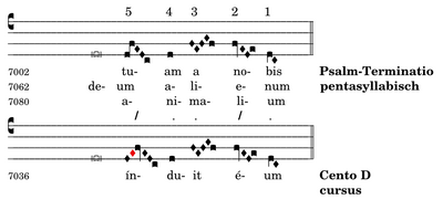 Der Cento D (Terminatio D, Terminatio der 2.Zeile) verwendet die selbe Formel wie die Psalm-Terminatio. Während aber im Psalm die Formel pentasyllabisch (die letzten 5 Silben ohne Rücksicht auf Akzente) behandelt wird, wird sie im Cento D den Sprachakzenten nach, den Regeln des Cursus entsprechend behandelt.