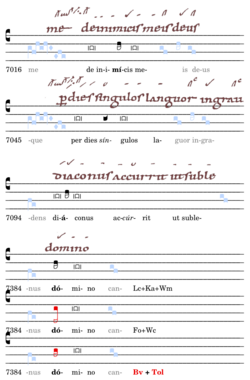 1 klassische EndsilbenClivis, die nur in Wc zum Trc erweitert ist. Wc hat allerdings mehrere Möglichkeiten für die letzte Neume.