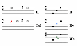 Die traditio occidentalis gruppiert die Töne der 6-stufigen Neume + unisonische Clivis ( = 7 Stufen) anders: ClvSpp + Trc 4 + 3 Stufen ( = 7 Stufen ).
